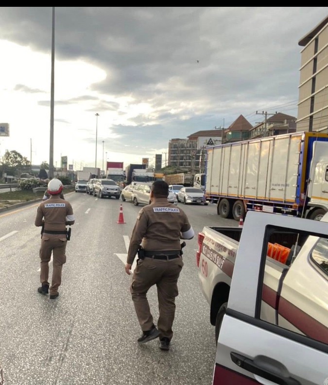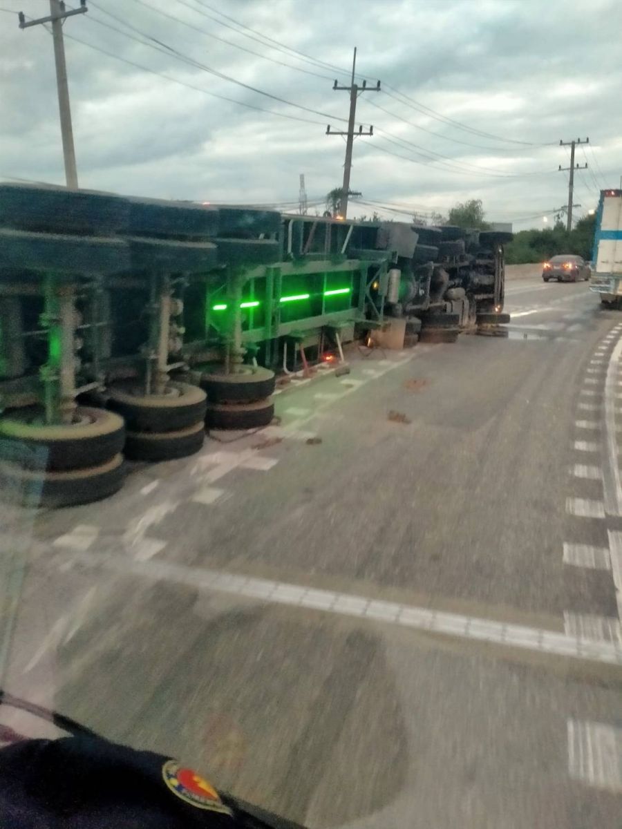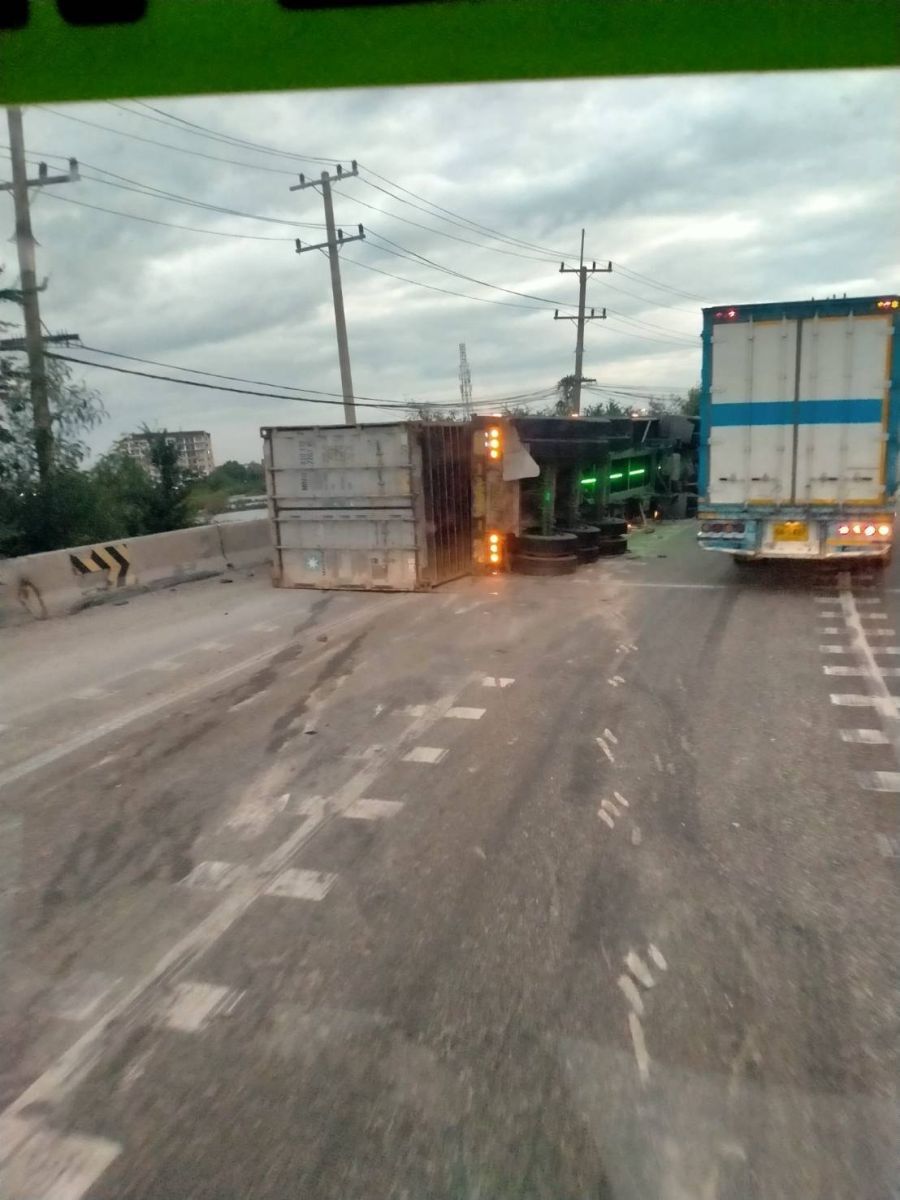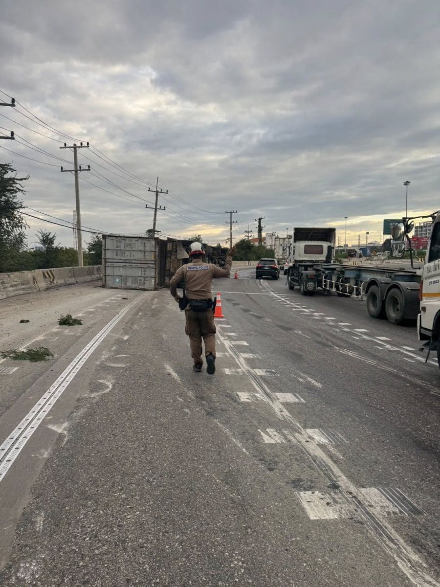 วันที่ 5 ธันวาคม 2568 เวลาประมาณ 07.10 น. ทางหลวงหมายเลข 361 ถนนเลี่ยงเมืองชลบุรี ขาเข้า มุ่งหน้ากรุงเทพ บนสะพานต่างระดับหนองไม้แดง รถบรรทุกพ่วงบรรทุกตู้คอนเทนเนอร์ พลิกตะแคง ส่งผลให้การจราจรติดขัดมาก มีจราจร สภ.เมืองชลบุรี คอยอำนวยความสะดวก รถผ่านได้ 1 ช่องทาง