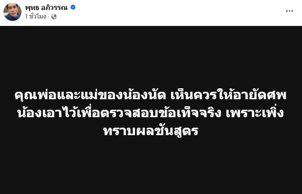 ล่าสุด พุทธ อภิวรรณ ผู้ประกาศดัง โพสต์ว่า "คุณพ่อและแม่ของน้องนัด เห็นควรให้อายัดศพ น้องเอาไว้ เพื่อตรวจสอบข้อเท็จจริง เพราะเพิ่งทราบผลชันสูตร" พร้อมคอมเมนต์เพิ่มเติมว่า "ขอแสดงความเห็นให้เกียรติน้องณัฐวุฒิ ด้วยนะครับ ผมและพี่ ธนกฤต จิตอารีย์รัตน์ และคุณหมอ -ตำรวจ จะหาความจริงให้ได้ครับ"