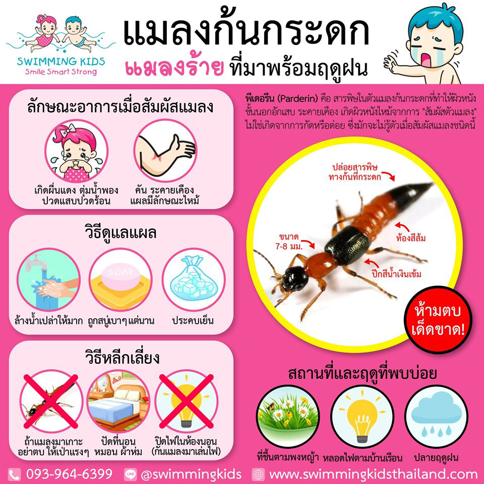 นายแพทย์อัครฐาน จิตนุยานนท์ รองอธิบดีกรมการแพทย์ กล่าวว่า “ด้วงก้นกระดก หรือ ด้วงปีกสั้น เป็นแมลงลำตัวยาว สีส้มสลับดำ ตัวแมลงไม่ได้กัดหรือดูดเลือด แต่จะปล่อยสารพิษชื่อ “เพเดอริน (Pederin)” ออกมาเมื่อถูกรบกวน เช่น ถูกปัด ถูกบีบ หรือถูกขยี้ ทำให้ผิวหนังบริเวณที่สัมผัสเกิดการอักเสบ ผู้ป่วยมักมีผื่นแดง แสบร้อน คัน หรือเกิดตุ่มน้ำ โดยอาการมักเริ่มขึ้นภายใน 24 ชั่วโมง พบบ่อยบริเวณใบหน้า คอ แขน ขา และลำตัว