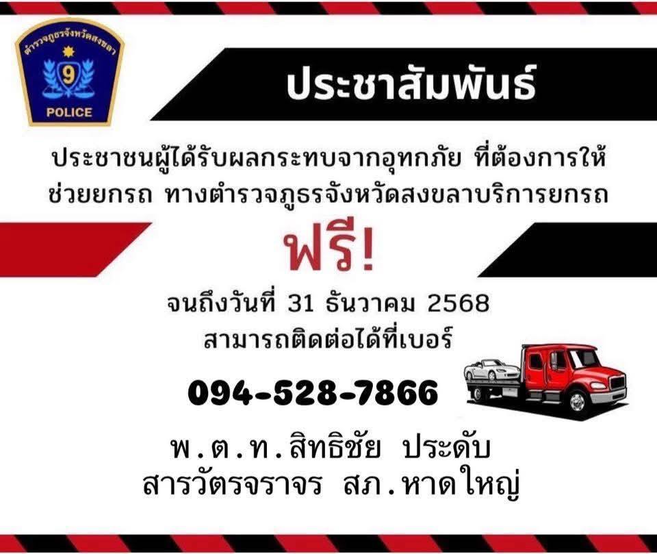 ทั้งนี้ ผู้ที่เป็นเจ้าของรถ หรือผู้ครอบครองรถในพื้นที่ประสบภัยน้ำท่วมในครั้งนี้ สามารถติดต่อขอรับคืนได้ และหากต้องการให้ช่วยยกรถ ทางเจ้าหน้าที่ตำรวจบริการให้ทุกท่านฟรีไม่มีค่าใช้จ่าย โดยติดต่อได้ที่ สภ.หาดใหญ่ หรือทางหมายเลขโทรศัพท์ 094-5287866 ได้จนถึงวันที่ 31 ธันวาคม 2568