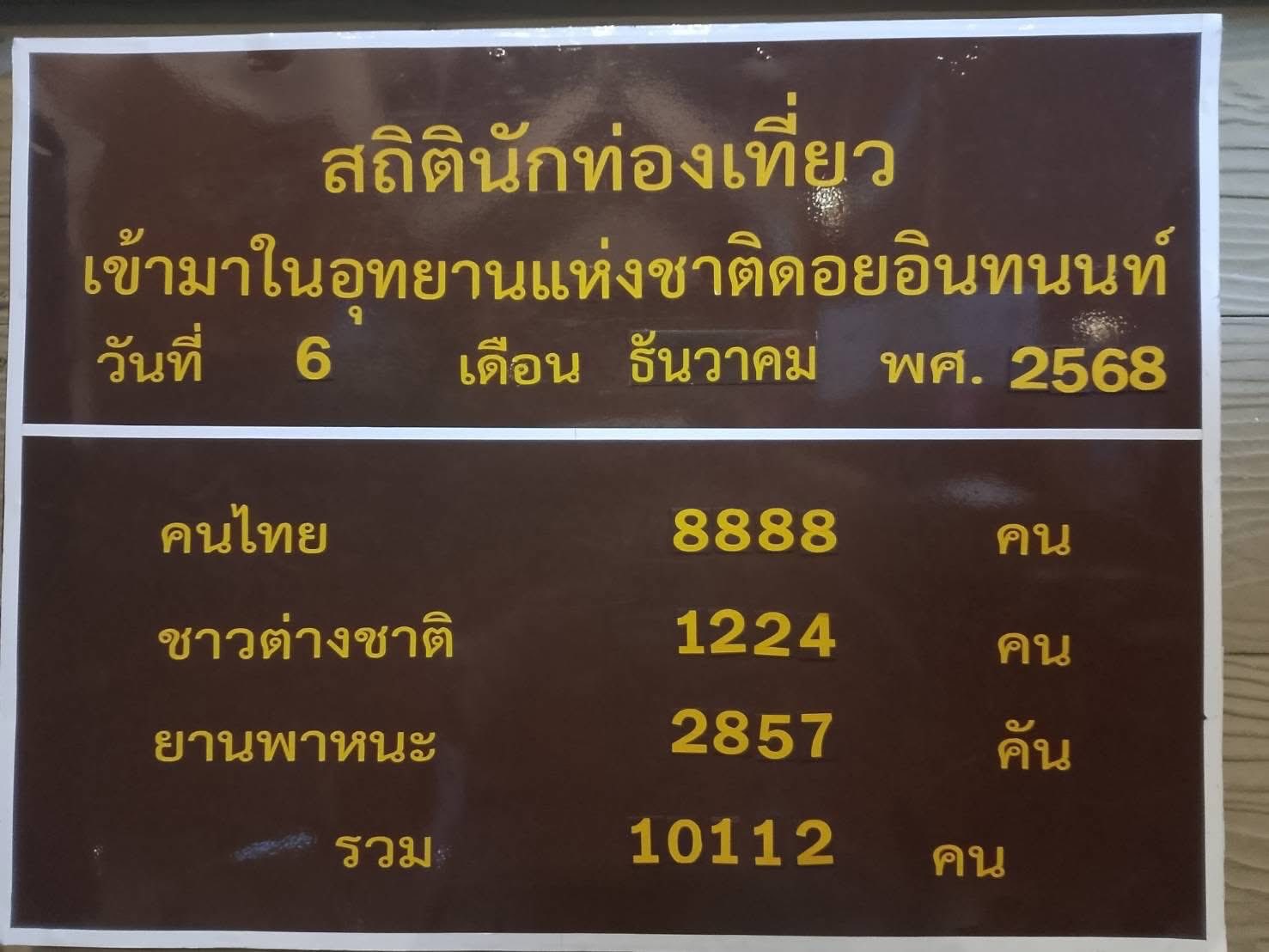เมื่อวันที่ 6 ธันวาคม 2568 อุทยานแห่งชาติดอยอินทนนท์ มีนักท่องเที่ยวแห่ขึ้นสัมผัสอากาศหนาว และชมทะเลหมอกรวมทั้งสิ้น 10,112 คน ภายในวันเดียว! นับเป็นสถิติ สูงที่สุดของฤดูหนาวปีนี้ นักท่องเที่ยวชาวไทย 8,888 คน นักท่องเที่ยวชาวต่างชาติ 1,224 คน ยานพาหนะ 2,857 คัน