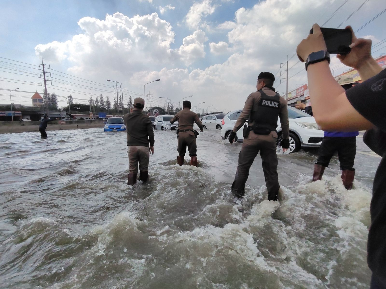 อัปเดตสถานการณ์น้ำทะเลหนุน! ถนนพระราม 2 ฝั่งขาเข้า กรุงเทพฯ ช่วง กม.39+800 หน้าดูโฮม มหาชัย น้ำท่วมขังผิวการจราจร ในช่องทางหลักสูงมาก ระดับ 30-60 ซม. เจ้าหน้าที่ขอความร่วมมือผู้ขับขี่รถบรรทุก รถใหญ่ แนะนำวิ่งช่องทางขวา เพื่อเปิดทางให้รถนั่งส่วนบุคคล รถเล็กเบี่ยงออกช่องทางคู่ขนานได้สะดวก #รายงานจราจร #รถติด #น้ำหนุน #น้ำทะเลหนุน #FM91