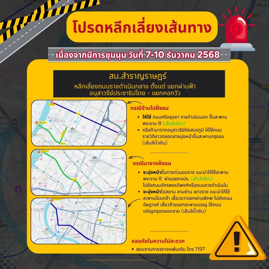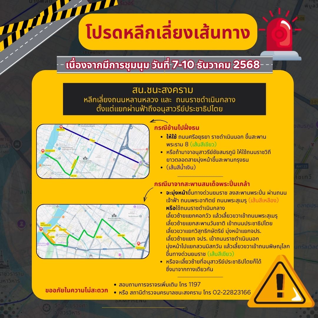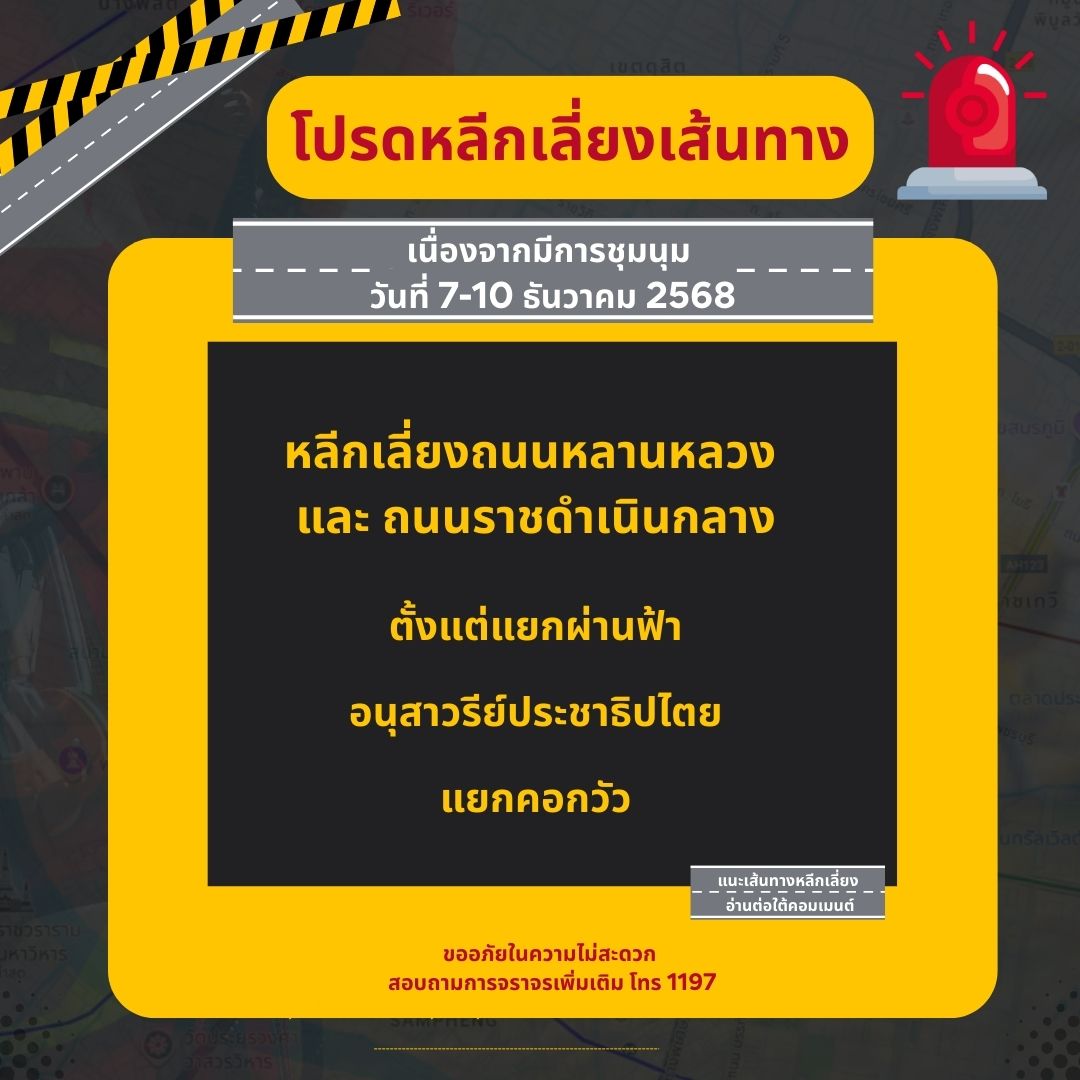 บช.น. แนะ หลีกเลี่ยงเส้นทาง ถนนหลานหลวง - ถนนราชดำเนินกลาง เนื่องจากมีการชุมนุม วันที่ 7 - 10 ธันวาคม 2568