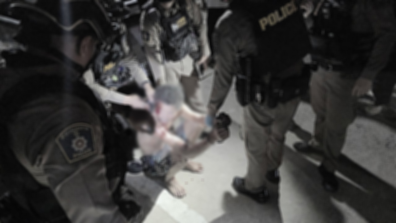 ตำรวจชุดสยบคลั่งถูกระดมเข้าตรึงพื้นที่ พร้อมโล่กำบังและไม้ง่ามครบชุด เตรียมเข้าชาร์จ ก่อนเจ้าหน้าที่พุ่งเข้าล็อกตัวขณะผู้ก่อเหตุหลบอยู่บริเวณชั้นล่างของร้านซ่อมรถ จนเกิดเหตุชุลมุนของกระจัดกระจาย อุปกรณ์ซ่อมรถล้มระเนระนาด และกระจกกลางร้านแตกเสียหายจากแรงปะทะ ใช้เวลาหลายนาทีจึงควบคุมตัวได้ สภาพของชายคนดังกล่าว เต็มไปด้วยเลือดทั่วตัวจากบาดแผลที่เกิดระหว่างหลบหนี