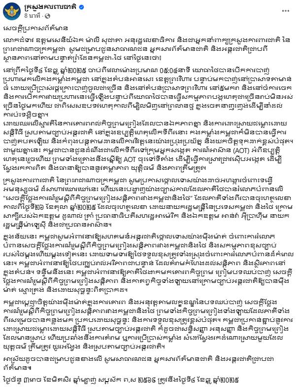 "กัมพูชาปฏิบัติตามเงื่อนไขของข้อตกลงหยุดยิงตามข้อตกลงที่บรรลุในอดีต รวมถึงสนธิสัญญา อนุสัญญา และข้อตกลงที่มีอยู่ โดยมุ่งหวังที่จะหาทางออกที่ยุติธรรม ยั่งยืน และสอดคล้องกับกฎหมายระหว่างประเทศ"