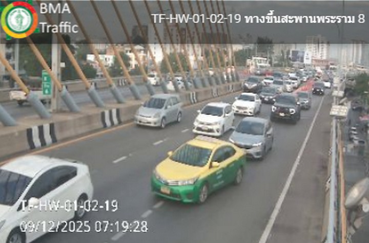 07.20 น. คู่ขนานลอยฟ้าบรมราชชนนี และถนนบรมราชชนนี ขาเข้า มุ่งหน้าสะพานพระราม 8 และสะพานสมเด็จพระปิ่นเกล้า