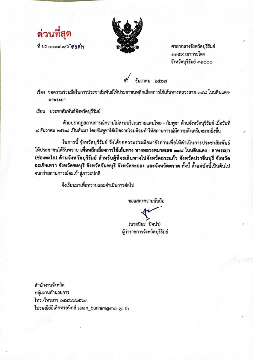 เรียน ประชาสัมพันธ์จังหวัดบุรีรัมย์ ด้วยปรากฏสถานการณ์ความไม่สงบบริเวณชายแดนไทย - กัมพูชา ด้านจังหวัดบุรีรัมย์ เมื่อวันที่ 8 ธันวาคม 2568 เป็นต้นมา โดยกัมพูชาได้เปิดฉากโจมตีจนทําให้สถานการณ์มีความตึงเครียดมากยิ่งขึ้น