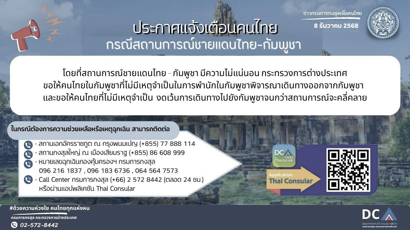 “กรณีสถานการณ์ชายแดนไทย-กัมพูชา” โดยที่สถานการณ์ชายแดนไทย - กัมพูชา มีความไม่แน่นอน กระทรวงการต่างประเทศ ขอให้คนไทยในกัมพูชาที่ไม่มีเหตุจำเป็นในการพำนักในกัมพูชาพิจารณาเดินทางออกจากกัมพูชา และขอให้คนไทยที่ไม่มีเหตุจำเป็น งดเว้นการเดินทางไปยังกัมพูชาจนกว่าสถานการณ์จะคลี่คลาย
