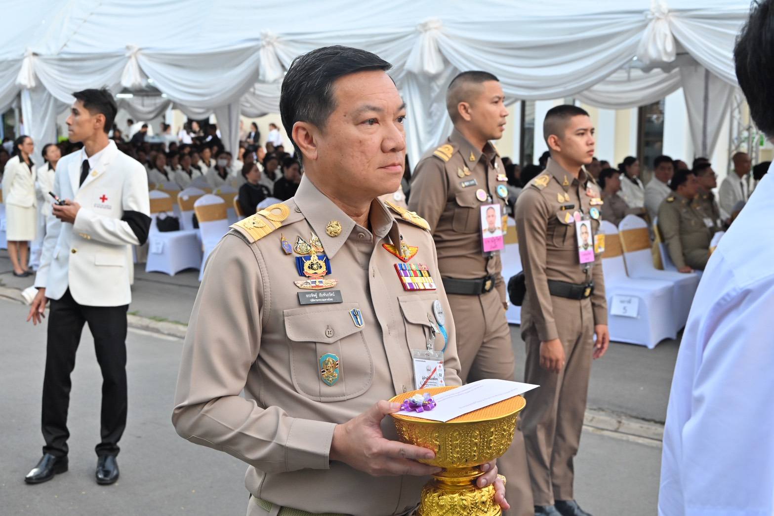 โอกาสนี้ นายอรรษิษฐ์ สัมพันธรัตน์ ปลัดกระทรวงมหาดไทย พร้อมด้วย นางจิณณารัชช์ สัมพันธรัตน์ นายกสมาคมแม่บ้านมหาดไทย ร่วมเข้าเฝ้าทูลละอองธุลีพระบาทรับเสด็จฯ พร้อมนำคณะผู้บริหารระดับสูงของกระทรวงมหาดไทย ได้แก่ นายพรพจน์ เพ็ญพาส อธิบดีกรมที่ดิน นายสยาม ศิริมงคล อธิบดีกรมการพัฒนาชุมชน นายนฤชา โฆษาศิวิไลซ์ อธิบดีกรมการปกครอง นายธีรพัฒน์ คัชมาตย์ อธิบดีกรมป้องกันและบรรเทาสาธารณภัย นายพงษ์นรา เย็นยิ่ง อธิบดีกรมโยธาธิการและผังเมือง และนายธีรุตม์ ศุภวิบูลย์ผล อธิบดีกรมส่งเสริมการปกครองท้องถิ่น ทูลเกล้าทูลกระหม่อมถวายเงินโดยเสด็จพระราชกุศลบำรุงสภากาชาดไทย และนำผู้ว่าราชการจังหวัด นายกเหล่ากาชาดจังหวัด อุปนายกสมาคมแม่บ้านมหาดไทย ที่ปรึกษานายกสมาคมแม่บ้านมหาดไทย ประธานแม่บ้านมหาดไทยจังหวัด ข้าราชการสำนักงานปลัดกระทรวงมหาดไทย ร่วมเข้าเฝ้าทูลละอองธุลีพระบาท และทูลเกล้าทูลกระหม่อมถวายของที่ระลึก ก่อนเสด็จพระราชดำเนินกลับ