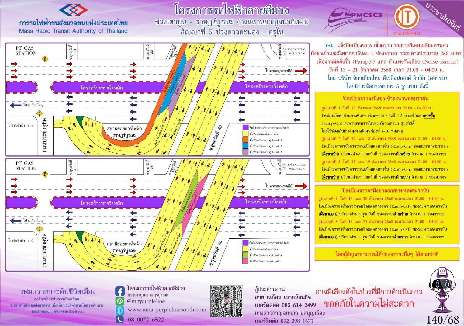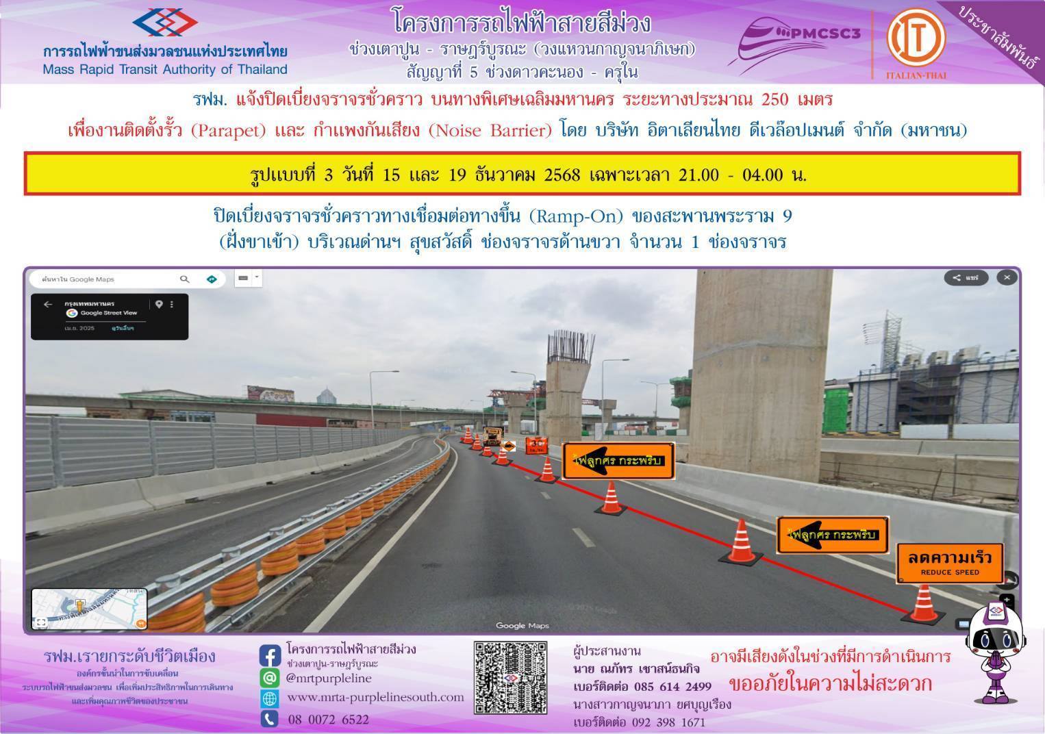 การทางพิเศษแห่งประเทศไทย (กทพ.) กระทรวงคมนาคม ได้รับการประสานงานจาก การรถไฟฟ้า ขนส่งมวลชนแห่งประเทศไทย (รฟม.) แจ้งว่า บริษัท อิตาเลียนไทย ดีเวล๊อปเมนต์ จำกัด (มหาชน) ผู้รับจ้างงานก่อสร้างทางวิ่งและสถานียกระดับ อาคารจอดรถไฟฟ้าและอาคารจอดแล้วจร โครงการรถไฟฟ้าสายสีม่วง ช่วงเตาปูน - ราษฎร์บูรณะ (วงแหวนกาญจนาภิเษก) สัญญาที่ 5 ช่วงดาวคะนอง – ครุใน จึงมีความจำเป็นต้องปิดเบี่ยงจราจรชั่วคราว บนทางพิเศษเฉลิมมหานคร ระยะทางประมาณ 250 เมตร เพื่องานติดตั้งรั้ว (Parapet) และกำแพงกันเสียง (Noise Barrier) ในวันที่ 13 - 21 ธันวาคม 2568 เฉพาะเวลา 21.00 - 04.00 น. โดยมีการจัดการจราจร 5 รูปแบบ ดังนี้