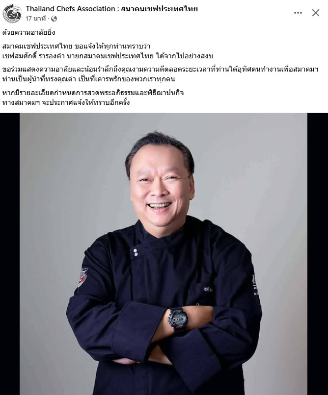 เชฟสมศักดิ์ รารองคำ นายกสมาคมเชฟประเทศไทย ได้จากไปอย่างสงบ