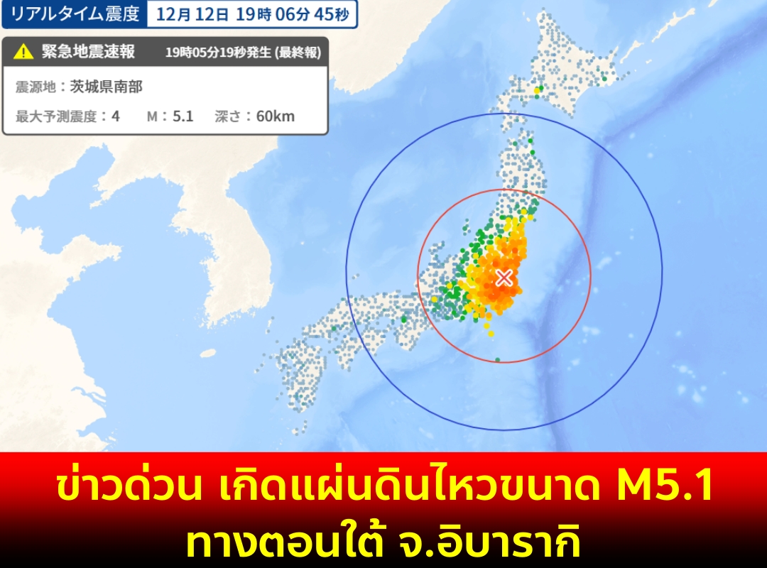 เพจ ครบเครื่องเรื่องญี่ปุ่น รายงานข่าวด่วน วันนี้ 12 ธ.ค. เวลา 19.06 ตามเวลาในญี่ปุ่น ได้เกิดแผ่นดินไหว ขนาด M.5.1 ศูนย์กลางอยู่ จ.อิบารากิ