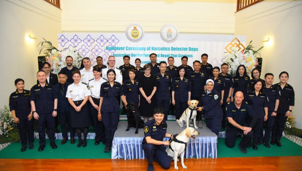 ในวันนี้ กรมศุลกากร ได้รับมอบสุนัขตรวจค้นยาเสพติด จำนวน 3 ตัว จากสำนักงานพิทักษ์เขตแดนแห่งออสเตรเลีย (The Australian Border Force: ABF) ได้แก่ Pixel Wafer และ Walshy โดยได้รับเกียรติจาก H.E. Dr. Angela Jane Macdonald เอกอัครราชทูตออสเตรเลีย ประจำประเทศไทย, Superintendent James Ryan และเจ้าหน้าที่จาก ABF เข้าร่วมพิธี ซึ่งการมอบสุนัขตรวจค้นในครั้งนี้ เป็นความร่วมมือระหว่างกรมศุลกากรและสำนักงานพิทักษ์เขตแดนแห่งออสเตรเลีย ภายใต้โครงการ ABF - Thai Customs Detector Dog Cooperation 2024–2027 ซึ่งเป็นความร่วมมือด้านการพัฒนาศักยภาพ ความเชี่ยวชาญ องค์ความรู้ ทักษะ และเทคนิคต่าง ๆ ให้แก่ทีมสุนัขตรวจค้นของกรมศุลกากรในการร่วมปฏิบัติภารกิจด้านการสืบสวนและปราบปรามให้มีมาตรฐานระดับสากล