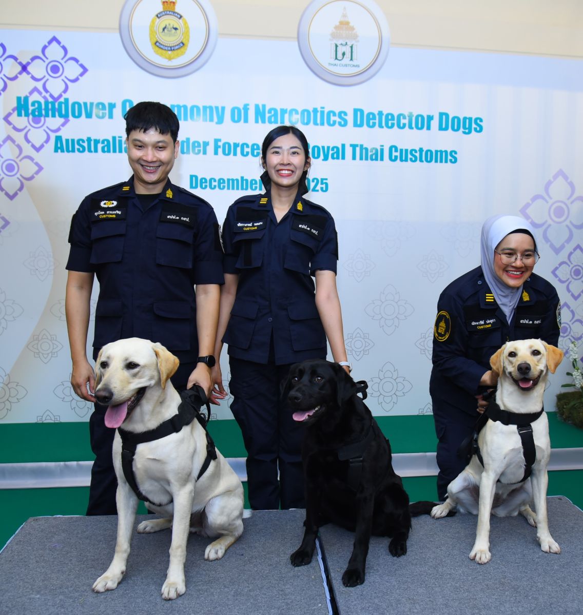 วันที่ 11 ธันวาคม 2568 นายพันธ์ทอง ลอยกุลนันท์ อธิบดีกรมศุลกากร เป็นประธานในการรับมอบสุนัขตรวจค้นยาเสพติด จำนวน 3 ตัว จากสำนักงานพิทักษ์เขตแดนแห่งออสเตรเลีย (The Australian Border Force: ABF) ได้แก่ Pixel, Wafer และ Walshy เพื่อสนับสนุนภารกิจด้านการป้องกันและปราบปรามการลักลอบค้ายาเสพติด และเสริมสร้างประสิทธิภาพในการบังคับใช้กฎหมายศุลกากร ณ ห้องโถง อาคาร 2 กรมศุลกากร