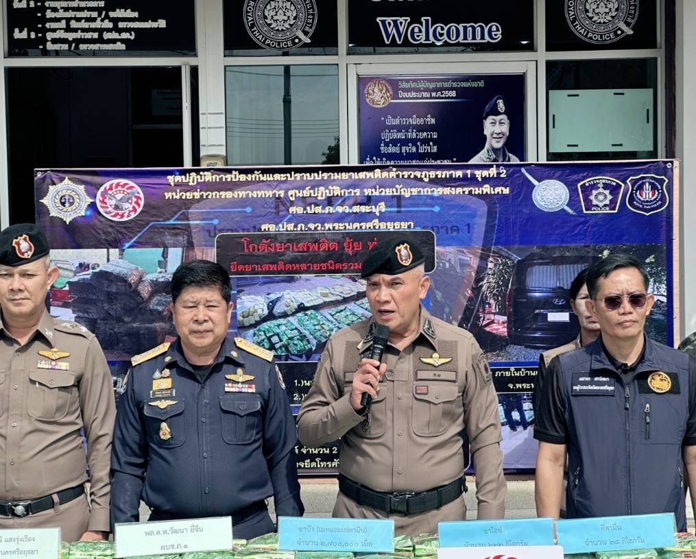 เมื่อวันที่ 12 ธ.ค. 68 ที่ สภ.ท่าเรือ จ.พระนครศรีอยุธยา พล.ต.ท.วัฒนา ยี่จีน ผบช.ภ.1 พล.ต.ต.สถาพร เอมโอษฐ์ รอง ผบช.ภ.1 พล.ต.ต.สุรวุฒิ แสงรุ่งเรือง ผบก.ภ.จว.พระนครศรีอยุธยา พล.ต.ต.ธรรมนูญ เชาวะนิชย์ ผบก.ภ.จว.สระบุรี นายเดชาธร เชาว์เลขา รองผวจ.พระนครศรีอยุธยา พ.อ.ศรายุทธ พัฒนชัย ผบ.ขกท.ศปก.นสศ. นายอำนาจ เหล่ากอที ผอ.ปปส.ภ.1 ร่วมกันแถลงข่าวผลการจับกุมเครือข่ายยาเสพติด “โกดัง ยุ้ย ท่าเรือ” พร้อมของกลางยาบ้า 2,700,000 เม็ด ไอซ์ 222 กิโลกรัม เคตามีน 28 กิโลกรัม รถตู้แวนใช้ลำเลียงยาเสพติด 1 คัน รถเก๋งใช้กระจายยาเสพติด 1 คัน รถจักรยานยนต์ ใช้ในการกระจายยาเสพติด 1 คัน มือถือใช้ในการติดต่อซื้อขายยาเสพติด 2 เครื่อง จับกุมผู้ต้องหาได้ 2 ราย คือ นายเอ (นามสมมุติ) อายุ 32 ปี ชาว ต.ตลาดน้อย อ.บ้านหมอ จ.สระบุรี และนางสาวบี (นามสมมุติ) อายุ 42 ปี ชาว ต.จำปา อ.ท่าเรือ จ.พระนครศรีอยุธยา