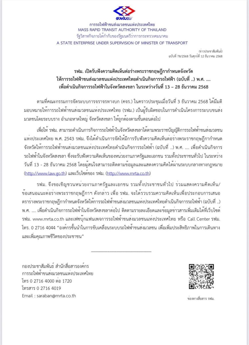เพื่อให้ รฟม. สามารถดำเนินการกิจการรถไฟฟ้าในจังหวัดสงขลาได้ตามพระราชบัญญัติการรถไฟฟ้าขนส่งมวลชนแห่งประเทศไทย พ.ศ. 2543 รฟม. จึงได้ดำเนินการจัดให้มีการรับฟังความคิดเห็นต่อร่างพระราชกฤษฎีกากำหนดจังหวัดให้การรถไฟฟ้าขนส่งมวลชนแห่งประเทศไทยดำเนินกิจการรถไฟฟ้า (ฉบับที่ ..) พ.ศ. …. เพื่อดำเนินกิจการรถไฟฟ้าในจังหวัดสงขลา ซึ่งจะรับฟังความคิดเห็นของหน่วยงานภาครัฐและเอกชน รวมทั้งประชาชนทั่วไป ในระหว่างวันที่ 13 - 28 ธันวาคม 2568 โดยผู้สนใจสามารถติดตามข้อมูลและแสดงความคิดได้ผ่านระบบกลางทางกฎหมาย (http://www.law.go.th) และเว็บไซต์ของ รฟม. (http://www.mrta.co.th)