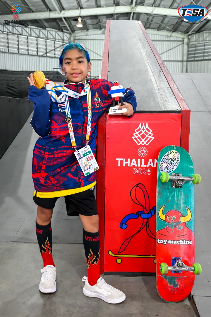 น้องมินิ เด็กหญิงจันทร์เก้า อุดมเพ็ญ นักสเก็ตบอร์ดทีมชาติไทย วัย 10 ปี คว้าเหรียญทองซีเกมส์สเก็ตบอร์ด ประเภทสตรีท หลังทำได้ 160.34 คะแนน