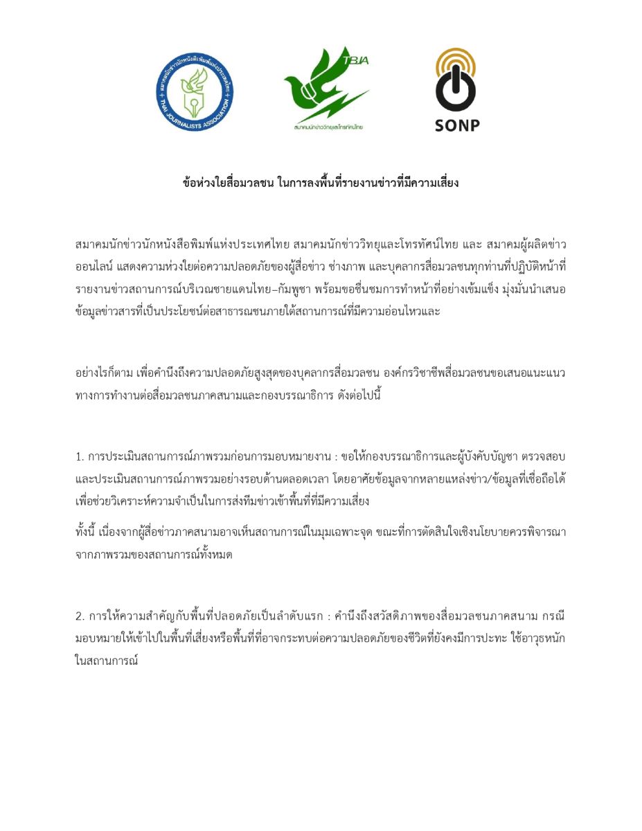 สมาคมนักข่าวนักหนังสือพิมพ์แห่งประเทศไทย สมาคมนักข่าววิทยุและโทรทัศน์ไทย สมาคมผู้ผลิตข่าวออนไลน์ ออกแถลงการณ์ข้อห่วงใยสื่อมวลชน ในการลงพื้นที่รายงานข่าวที่มีความเสี่ยง เรียกร้อง บก.คำนึงความปลอดภัย นักข่าว-ช่างภาพ โดยมีการเรียกร้อง 2 ข้อคือ