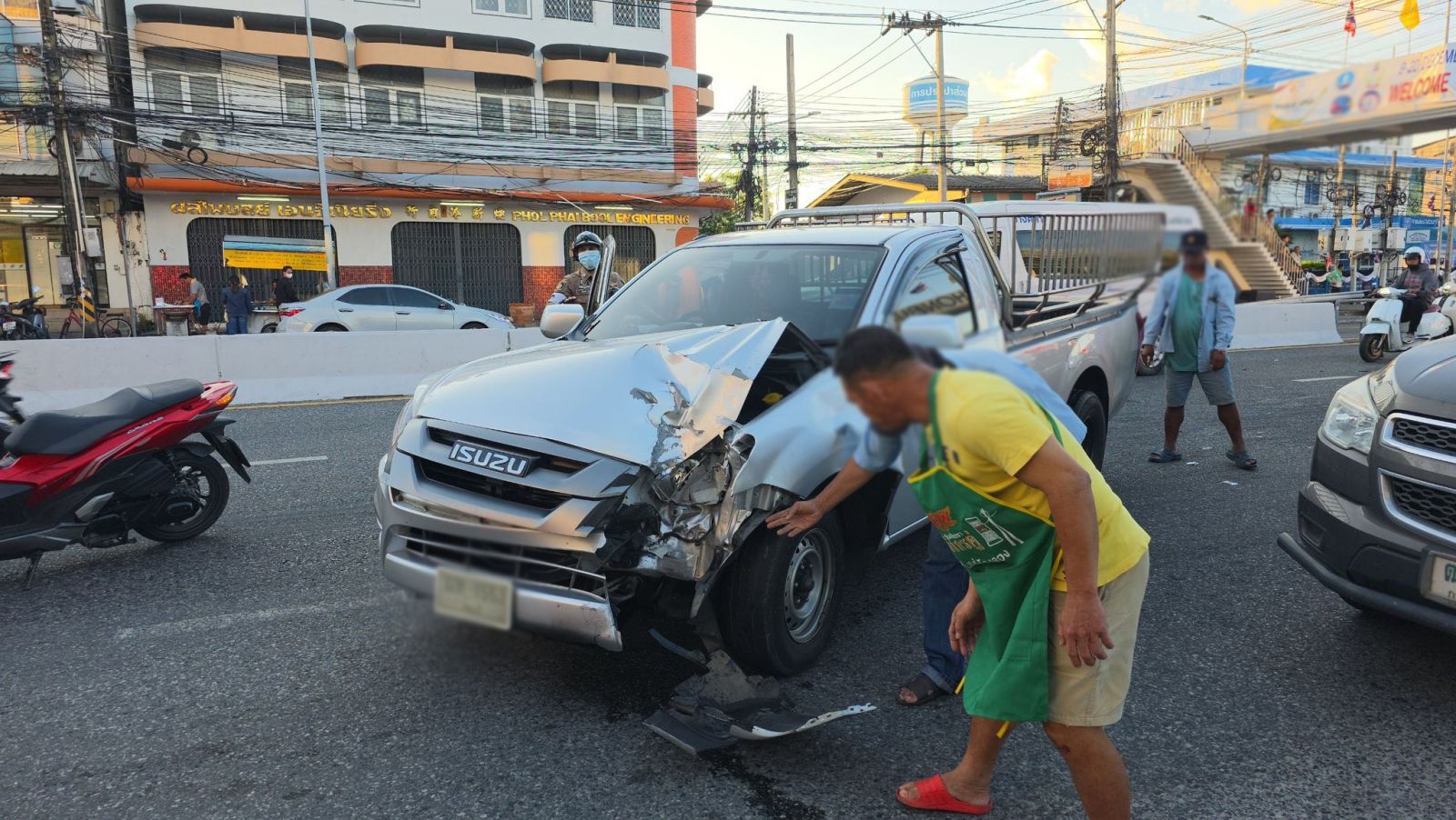 รถกระบะชนกับรถกระบะโดยสารสองแถว กลางถนนสุขุมวิท พบชาวบ้านและนักเรียนบาดเจ็บระนาว จ.ชลบุรี