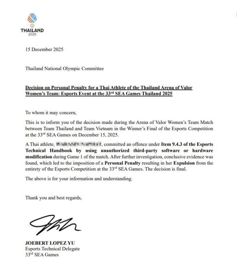 ตามสาเหตุ : กระทำความผิดตามรายการที่ 9.4.3 ของคู่มือเทคนิคอีสปอร์ต โดยใช้ซอฟต์แวร์ของบุคคลที่สามที่ไม่ได้รับอนุญาต หรือการดัดแปลงฮาร์ดแวร์ในระหว่างการแข่งขัน เมื่อวันที่ 15 ธันวาคม 2568 โดยมีบทลงโทษ ให้ขับนักกีฬาคนดังกล่าวออกจากการแข่งขันในกีฬาซีเกมส์ ครั้งที่ 33