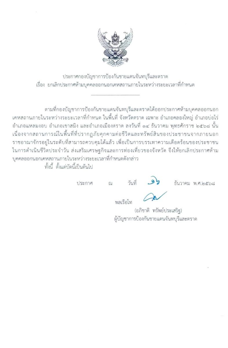 ประกาศล่าสุด กองบัญชาการป้องกันชายแดนจันทบุรีและตราด เรื่อง ยกเลิกประกาศห้ามบุคคลออกนอกเคหสถานภายในระหว่างระยะเวลาที่กําหนด ตามที่กองบัญชาการป้องกันชายแดนจันทบุรีและตราดได้ออกประกาศ ห้ามบุคคลออกนอก เคหสถานภายในระหว่างระยะเวลาที่กําหนด ในพื้นที่ จังหวัดตราด เฉพาะ อําเภอคลองใหญ่ อําเภอบ่อไร่ อําเภอแหลมงอบ อําเภอเขาสมิง และอําเภอเมืองตราด ลงวันที่ ๑๔ ธันวาคม พุทธศักราช ๒๕๖๘ นั้น