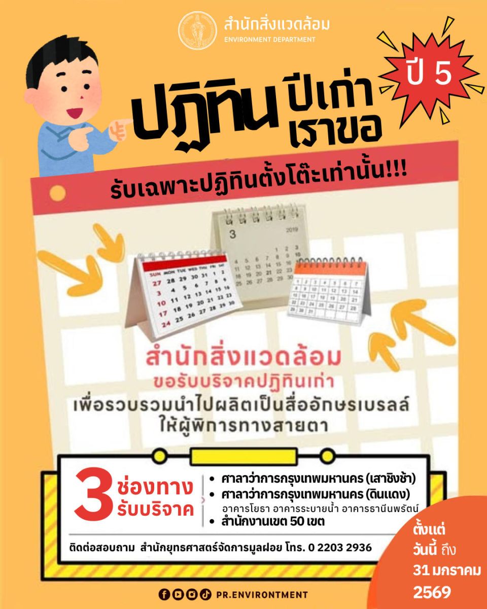 (16 ธ.ค. 68) นายเอกวรัญญู อัมระปาล โฆษกของกรุงเทพมหานคร เปิดเผยว่า กรุงเทพมหานคร โดยสำนักสิ่งแวดล้อม ขอชวนส่งปฏิทินตั้งโต๊ะของปีเก่า เพื่อส่งต่อให้กับมูลนิธิช่วยคนตาบอดแห่งประเทศไทย ในพระบรมราชินูปถัมภ์ นำไปผลิตเป็นสื่อการเรียนการสอนอักษรเบรลล์สำหรับผู้พิการทางสายตา ในกิจกรรม “ปฏิทินปีเก่า เราขอ” (ปีที่ 5) โดยบริจาคได้ตั้งแต่บัดนี้ จนถึงวันที่ 31 มกราคม 2569 ณ ศาลาว่าการกรุงเทพมหานคร (เสาชิงช้า) เขตพระนคร ศาลาว่าการกรุงเทพมหานคร 2 (ดินแดง) และสำนักงานเขตทั้ง 50 เขต