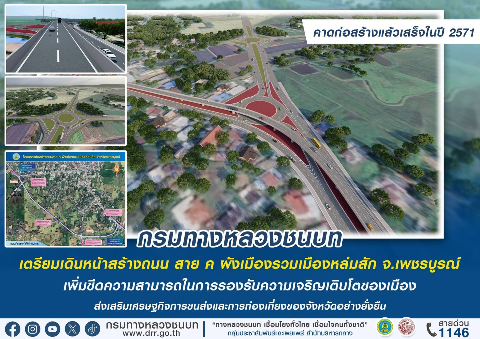 กรมทางหลวงชนบท (ทช.) ได้ดำเนินโครงการก่อสร้างถนน สาย ค ผังเมืองรวมเมืองหล่มสัก จังหวัดเพชรบูรณ์ เพื่อเชื่อมโยงโครงข่ายการคมนาคมทางถนนให้สมบูรณ์ เพิ่มขีดความสามารถในการรองรับความเจริญเติบโตของชุมชนโดยรอบทั้งในปัจจุบันและในอนาคต รวมไปถึง ช่วยลดปริมาณรถบรรทุกและมลภาวะที่เข้าสู่ตัวเมือง เป็นการเพิ่มความปลอดภัยในบริเวณชุมชน เพิ่มศักยภาพด้านการเดินทางในอำเภอหล่มสักและพื้นที่โดยรอบ ตลอดจนช่วยรองรับการขยายตัวทางด้านเศรษฐกิจ สังคม การค้าการท่องเที่ยวในอนาคต