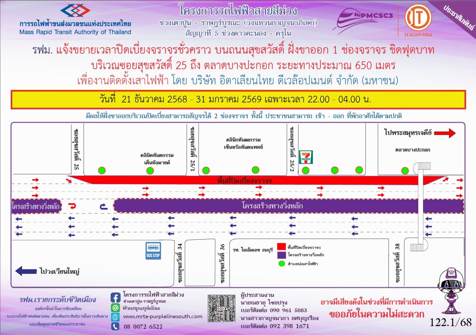 การรถไฟฟ้าขนส่งมวลชนแห่งประเทศไทย (รฟม.) แจ้งว่า บริษัท อิตาเลียนไทย ดีเวล๊อปเมนต์ จำกัด (มหาชน) ผู้รับจ้างงานก่อสร้างทางวิ่งและสถานียกระดับ อาคารจอดรถไฟฟ้าและอาคารจอดแล้วจร โครงการรถไฟฟ้าสายสีม่วง ช่วงเตาปูน - ราษฎร์บูรณะ (วงแหวนกาญจนาภิเษก) สัญญาที่ 5 ช่วงดาวคะนอง - ครุใน มีความจำเป็นต้องขยายเวลาปิดเบี่ยงจราจรชั่วคราว บนถนนสุขสวัสดิ์ ฝั่งขาออก 1 ช่องจราจร ชิดฟุตบาท บริเวณซอยสุขสวัสดิ์ 25 ถึง ตลาดบางปะกอก ระยะทางประมาณ 650 เมตร เพื่องานติดตั้งเสาไฟฟ้า ในวันที่ 21 ธันวาคม 2568 - 31 มกราคม 2569 เฉพาะเวลา 22.00 - 04.00 น. โดยมีผลให้ถนนสุขสวัสดิ์ ฝั่งขาออก บริเวณที่ปิดเบี่ยงสามารถสัญจรได้ 2 ช่องจราจร ทั้งนี้ ประชาชนสามารถเข้า-ออก ที่พักอาศัยได้ตามปกติ