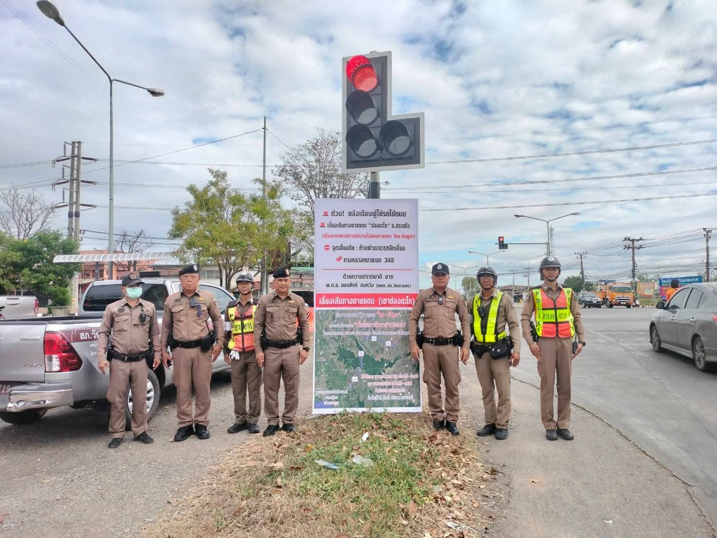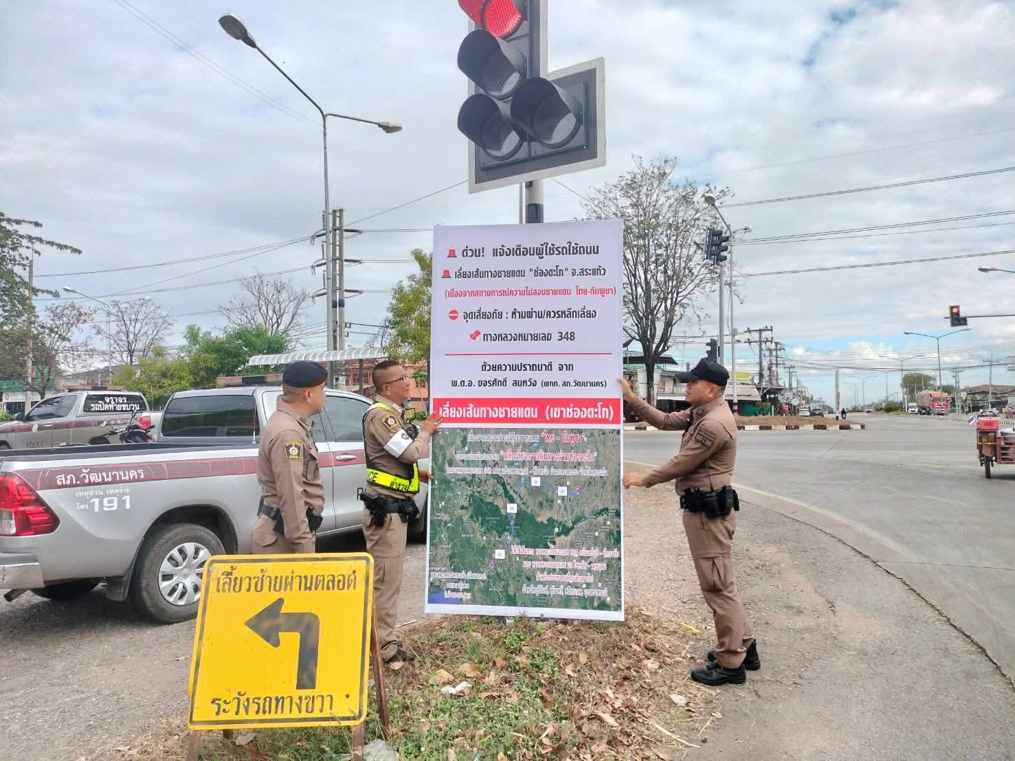 สำนักงานประชาสัมพันธ์ จังหวัดสระแก้ว ประชาสัมพันธ์ วันนี้ 22 ธันวาคม 2568 สภ.วัฒนานคร ลงพื้นที่ติดป้ายประชาสัมพันธ์ แนะนำจุดเสี่ยงภัย : ห้ามผ่าน/ควรหลีกเลี่ยง ทางหลวงหมายเลข 348 เส้นทางชายแดน (ช่องตะโก) โดยดำเนินการที่ ถนนสุวรรณศร (33) บริเวณสี่แยกวัฒนานคร เนื่องจากสถานการณ์การสู้รบ "ชายแดนไทยกัมพูชา"