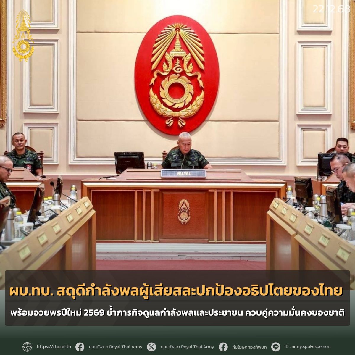 พร้อมกันนี้ เนื่องในวาระขึ้นปีใหม่ พุทธศักราช 2569 ในนามของกองทัพบก ผู้บัญชาการทหารบกได้อาราธนาคุณพระศรีรัตนตรัย และด้วยพระบารมีแห่งพระบาทสมเด็จพระเจ้าอยู่หัว รวมถึงดวง