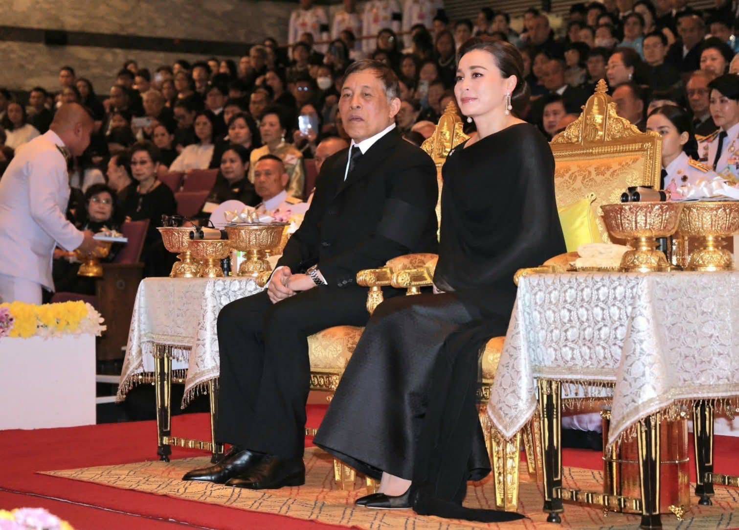 จากนั้น เสด็จ ฯ ไปยังหอประชุมใหญ่ พระราชทานพระบรมราชวโรกาสให้ นายประสพ เรียงเงิน ปลัดกระทรวงวัฒนธรรม เข้าเฝ้า ฯ ทูลเกล้า ฯ ถวายสูจิบัตร นางยุถิกา อิศรางกูร ณ อยุธยา อธิบดีกรมส่งเสริมวัฒนธรรม เข้าเฝ้า ฯ ทูลเกล้า ฯ ถวายสูจิบัตร แด่สมเด็จพระนางเจ้า ฯ พระบรมราชินี ศาสตราจารย์เกียรติคุณชริตา รักษ์พลเมือง เข้าเฝ้า ฯ ทูลเกล้า ฯ ถวายหนังสือที่ระลึก แด่พระบาทสมเด็จพระเจ้าอยู่หัว ผู้ช่วยศาสตราจารย์บัวรอง ลิ่วเฉลิมวงศ์ เข้าเฝ้า ฯ ทูลเกล้า ฯ ถวายของที่ระลึกแด่สมเด็จพระนางเจ้า ฯ พระบรมราชินี และนางเบญจวรรณ สร่างนิทร ประธานคณะกรรมการอำนวยการจัดการแสดง และกรรมการมูลนิธิสมาคมสตรีอุดมศึกษา แห่งประเทศไทย ในพระอุปถัมภ์ของ สมเด็จพระเจ้าพี่นางเธอ เจ้าฟ้ากัลยาณิวัฒนา กรมหลวงนราธิวาสราชนครินทร์ กราบบังคมทูลรายงานวัตถุประสงค์ของการจัดงาน ฯ พร้อมทั้งกราบบังคมทูลเชิญ ทอดพระเนตรการแสดงรำถวายอาลัย สมเด็จพระนางเจ้าสิริกิติ์ พระบรมราชินีนาถ พระบรมราชชนนีพันปีหลวง "ยี่สิบสี่ตุลา มหาวิปโยค" รำถวายพระพร และการแสดงละครเสภา เรื่อง "ขุนช้าง - ขุนแผน" ตอน พลายชุมพล ตามลำดับ