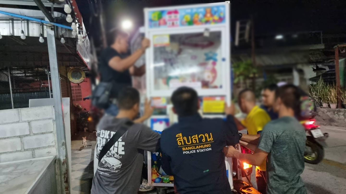 ตำรวจลุยตรวจสอบ จับกุม ตรวจยึดตู้คีบตุ๊กตา คาร้านหมูกระทะ ย่านบางละมุง จ.ชลบุรี