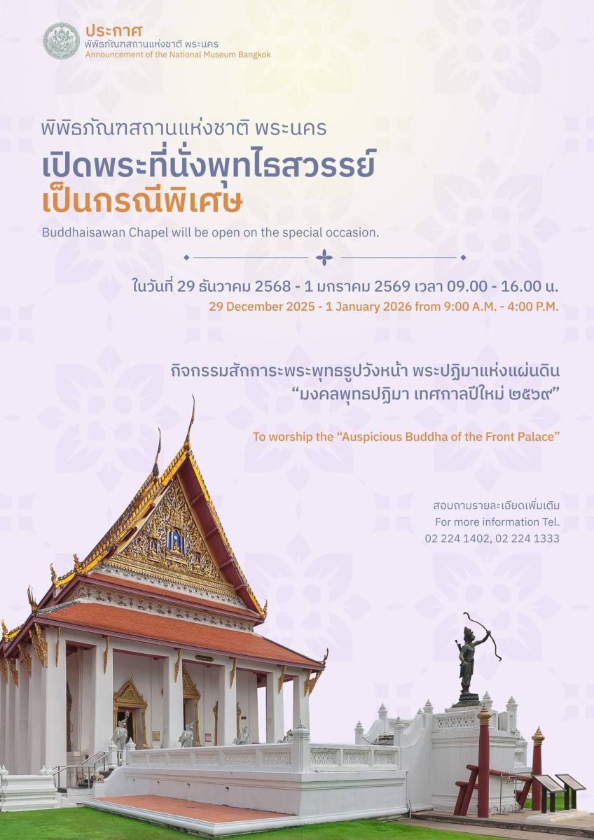นายพนมบุตร จันทรโชติ อธิบดีกรมศิลปากร เปิดเผยว่า เนื่องในโอกาสขึ้นปีใหม่ พุทธศักราช 2569 กระทรวงวัฒนธรรม ได้จัดกิจกรรมเพื่อเป็นของขวัญปีใหม่ให้กับประชาชน โดยกรมศิลปากร เปิดให้บริการและงดเก็บค่าธรรมเนียมเข้าชม พิพิธภัณฑสถานแห่งชาติ อุทยานประวัติศาสตร์ และโบราณสถานที่อยู่ในความดูแลของกรมศิลปากรทุกแห่ง ทั้งชาวไทยและชาวต่างชาติ รวม 2 วัน ระหว่างวันที่ 31 ธันวาคม 2568 ถึงวันที่ 1 มกราคม 2569 เพื่อให้ทุกคนในครอบครัวได้ใช้เวลาในการท่องเที่ยวทางวัฒนธรรมร่วมกัน ทั้งนี้ พิพิธภัณฑสถานแห่งชาติทั่วประเทศจะนำพระพุทธรูปมงคลโบราณที่มีประวัติความเป็นมาและสร้างขึ้นตามคติอันเป็นมงคล มาประดิษฐานให้พุทธศาสนิกชนสักการบูชา เพื่อความเป็นสิริมงคลแก่ชีวิตในวาระแห่งการเริ่มต้นศักราชใหม่ โดยเฉพาะพิพิธภัณฑสถานแห่งชาติ พระนคร ได้อัญเชิญพระพุทธรูปที่พระบาทสมเด็จพระปกเกล้าเจ้าอยู่หัว ทรงพระกรุณาโปรดเกล้าฯ พระราชทานแก่พิพิธภัณฑสถานสำหรับพระนคร มาประดิษฐานให้ประชาชนได้สักการบูชา ณ พระที่นั่งพุทไธสวรรย์ ระหว่างวันที่ 25 ธันวาคม 2568 - วันที่ 4 มกราคม 2569