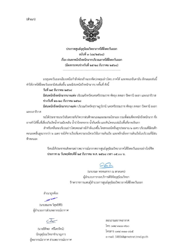 วันที่ 25 ธ.ค.2568 กรมอุตุนิยมวิทยา ศูนย์อุตุนิยมวิทยาภาคใต้ฝั่งตะวันออก ประกาศฉบับที่ 3 (84/2568) เรื่อง ฝนตกหนักถึงหนักมากบริเวณภาคใต้ฝั่งตะวันออก (มีผลกระทบช่วงวันที่ 25-28 ธันวาคม 2568) ระบุว่า