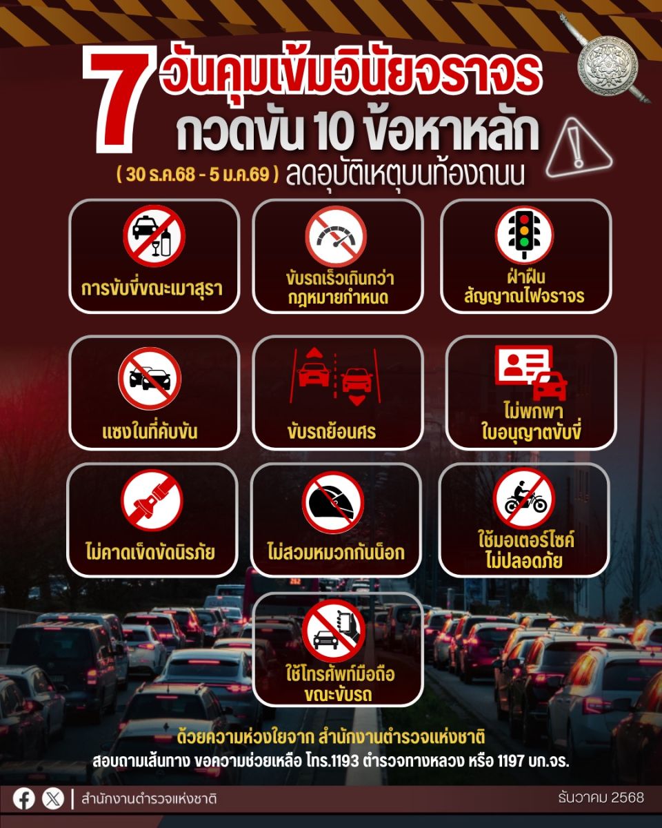 7 วันคุมเข้ม ลดอุบัติเหตุ “ปีใหม่ 2569” ตำรวจกวดขันวินัยจราจร 10 ข้อหาหลัก เพื่อลดอุบัติเหตุบนท้องถนน