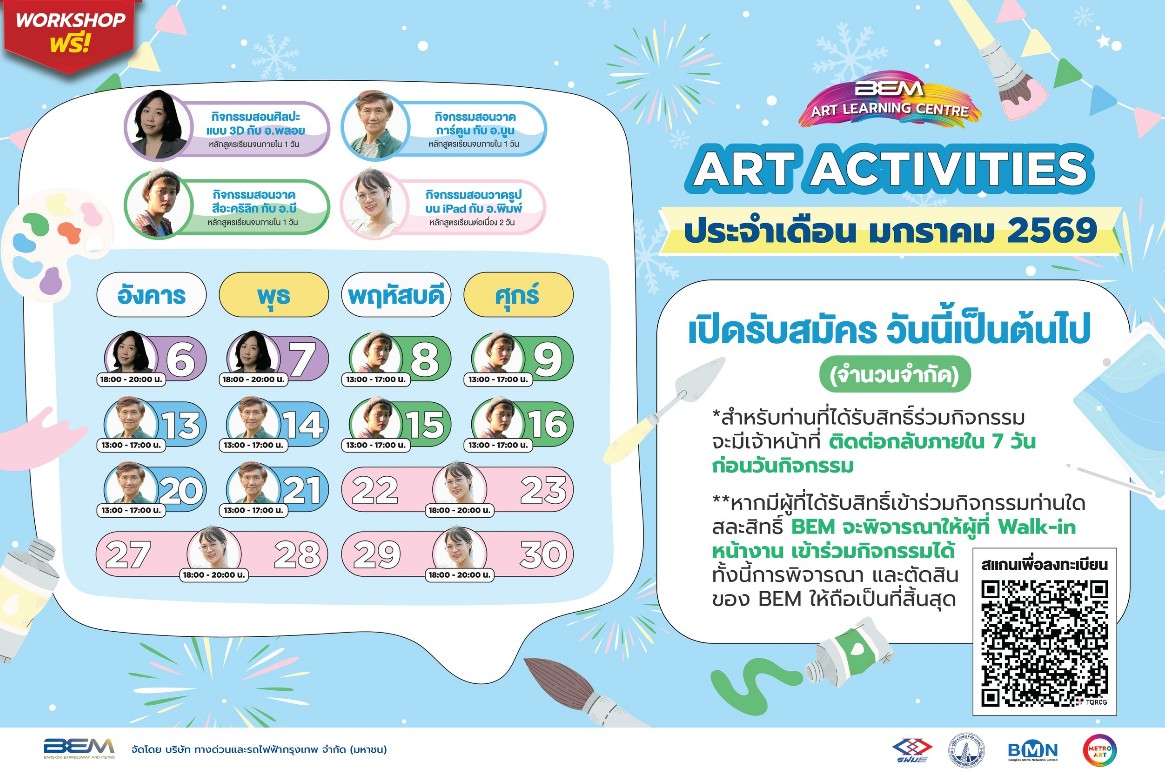 บริษัท ทางด่วนและรถไฟฟ้ากรุงเทพ จำกัด (มหาชน) หรือ BEM ชวนคนรักศิลปะและผู้ที่ต้องการเปิดสกิลความคิดสร้างสรรค์ต้อนรับปีใหม่เข้าร่วมกิจกรรม BEM Art Activities ประจำเดือนมกราคม 2569 ณ Art Learning Centre MRT สถานีพหลโยธิน พบกับหลากหลายคลาสศิลปะสุดพิเศษที่ทั้งสนุก ผ่อนคลาย และเรียนรู้ได้จริงโดยไม่มีค่าใช้จ่าย ได้แก่ การวาดภาพด้วยสีอะคริลิก โดย อ.บ่ายฟ้า นนท์เจริญ ศิลปินผู้เชี่ยวชาญด้านสีอะคริลิก นักการตลาด และนักคิดคอนเทนต์อิสระ การวาดการ์ตูน โดย อ.สมบุญ เกรียงอารีกุล หรือ BOON นักวาดระดับแถวหน้าของวงการอนิเมะ และผู้อยู่เบื้องหลังภาพปกหนังสือการ์ตูนชื่อดังมากมาย การวาดรูปบน iPad โดย อ.สาริน ปิติบัณฑิต เจ้าของแฟนเพจ Melt the moment และเปิดโลกงานศิลปะสามมิติ คลาสสอนศิลปะแบบ 3D จาก อ.พลอยฉัตร ถิรมงคล วิทยากรพิเศษ จากโรงเรียน RightCG ที่จะพาทั้งเด็กและผู้สนใจทั่วไปสนุกไปกับการสร้างสรรค์ผลงานศิลปะรูปแบบใหม่ ซึ่งผู้ที่สนใจเข้าร่วมทั้งสองคลาสจะต้องเตรียม iPad มาเรียนด้วย