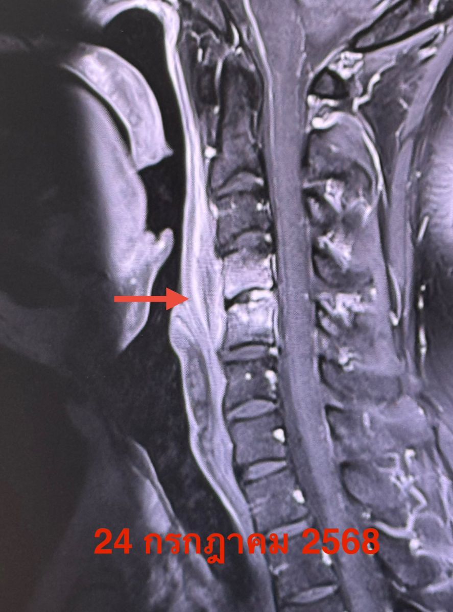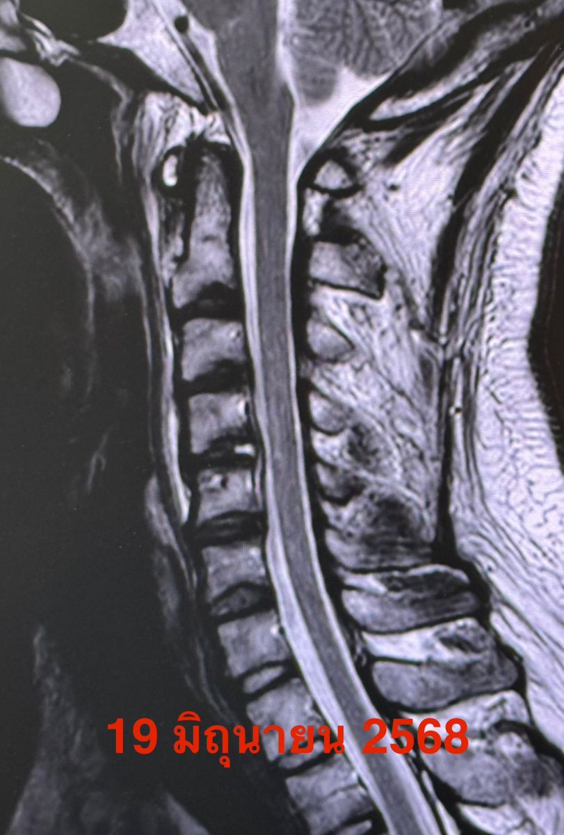 วันที่ 7 มิถุนายน 2568 มีไข้สูงหลังกินอาหารนอกบ้าน หลังจากนั้น 2 วันไข้ลงเอง เริ่มปวดต้นคอและไหล่ข้างขวา ขยับคอลำบาก ทำกายภาพไม่ดีขึ้น ตรวจคลื่นแม่เหล็กไฟฟ้าของกระดูกต้นคอ MRI