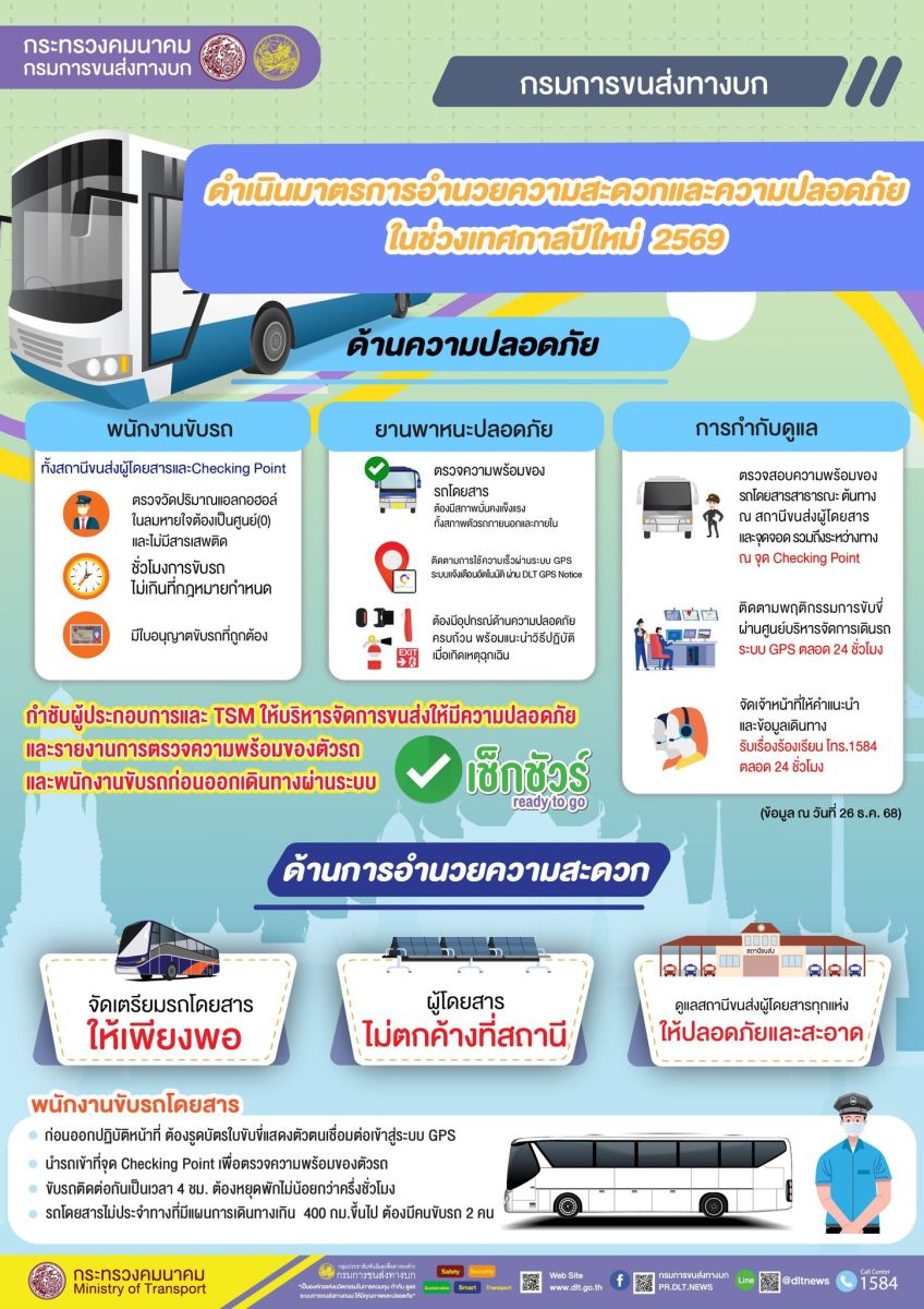 นายสรพงศ์ ไพฑูรย์พงษ์ อธิบดีกรมการขนส่งทางบก เปิดเผยว่า ช่วงเทศกาลปีใหม่ 2569 กรมการขนส่งทางบกเตรียมความพร้อมและมาตรการดูแลพี่น้องประชาชนรองรับการเดินทางกลับภูมิลำเนาและเดินทางไปพักผ่อนท่องเที่ยว ตามสถานที่ต่าง ๆ ให้ได้รับความสะดวกสบายและเดินทางถึงที่หมายโดยปลอดภัย มีความมุ่งมั่นลดการเกิดอุบัติเหตุทางถนน โดย อุบัติเหตุ ต้องเป็น “ศูนย์” ตามนโยบายของรัฐบาลและกระทรวงคมนาคม สำหรับการเดินทางด้วยรถโดยสารสาธารณะ กรมการขนส่งทางบกกำชับไปยังสำนักงานขนส่งจังหวัดทั่วประเทศให้ดำเนินการอำนวยความสะดวกประชาชน โดยจัดหารถโดยสารประจำทางและรถโดยสารไม่ประจำทางให้เพียงพอกับความต้องการเดินทางของประชาชนและตรวจสอบให้มีความปลอดภัย ทั้งเที่ยวไปและเที่ยวกลับ จัดตั้งศูนย์คุ้มครองผู้โดยสารรถสาธารณะชั่วคราว ตลอด 24 ชั่วโมง เพื่อรับเรื่องร้องเรียนและป้องกันไม่ให้ผู้โดยสารถูกเอารัดเอาเปรียบจากการใช้บริการรถโดยสารสาธารณะ จัดระเบียบภายในสถานีขนส่งผู้โดยสารทั้งด้านการรักษาความสะอาด การติดตั้งไฟฟ้าแสงสว่างภายในชานชาลาให้เพียงพอ รวมทั้งตรวจสอบการทำงานของกล้อง CCTV ให้สามารถใช้งานได้ตลอด 24 ชั่วโมง เพื่อดูแลความปลอดภัยของประชาชนผู้ใช้บริการ จัดระเบียบการเดินรถและการจราจรเข้า – ออก ภายในสถานีขนส่งผู้โดยสารทุกแห่งในเขตกรุงเทพมหานครและสถานีขนส่งผู้โดยสารในพื้นที่ต่างจังหวัด รวมทั้งจัดเจ้าหน้าที่อำนวยความสะดวก ในการเชื่อมต่อการเดินทาง และลดความหนาแน่นในบริเวณสถานีขนส่งผู้โดยสารและสถานีรถไฟ