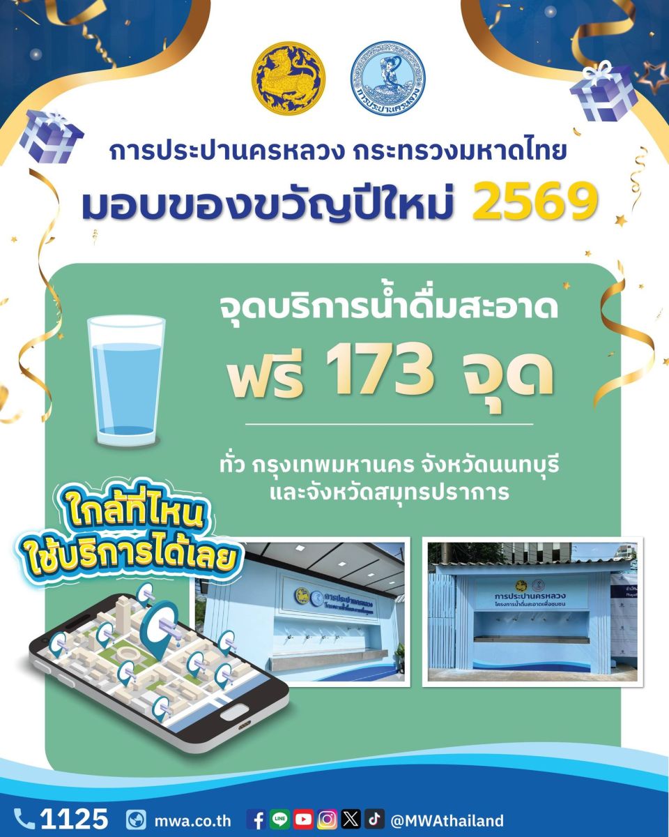 นางสาวสุวรา ทวิชศรี ผู้ว่าการการประปานครหลวง (กปน.) กล่าวว่า ตามที่กระทรวงมหาดไทยได้จัดทำโครงการของขวัญปีใหม่ของกระทรวงมหาดไทยเพื่อมอบให้ประชาชน ประจำปี พ.ศ. 2569 กปน. ขอส่งความสุขให้ประชาชนร่วมกับกระทรวงมหาดไทย ด้วยการมอบของขวัญปีใหม่ให้ประชาชน 2 โครงการ ได้แก่ “กปน. ร่วมใจลดภาระติดตั้งมิเตอร์ใหม่” และ “โครงการน้ำดื่มสะอาดเพื่อชุมชน” เพื่อช่วยลดรายจ่ายและส่งเสริมคุณภาพชีวิตประชาชนให้ได้รับน้ำประปาที่สะอาดปลอดภัยสำหรับใช้อุปโภค/ บริโภค