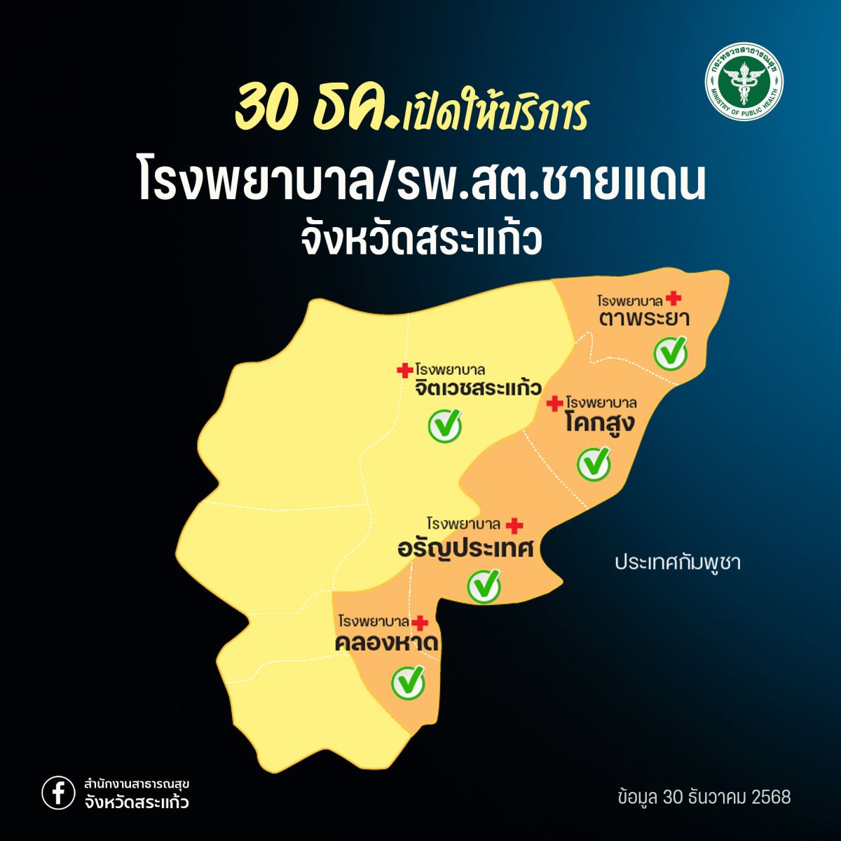 30 ธันวาคม 2568 เพจ สำนักงานสาธารณสุขจังหวัดสระแก้ว โพสต์ข้อความระบุ สืบเนื่องจากสถานการณ์ในพื้นที่ นายแพทย์สาธารณสุขจังหวัดสระแก้ว สั่งการให้โรงพยาบาลและ รพ.สต. ในพื้นที่ชายแดนเปิดให้บริการเพื่อดูแลพี่น้องประชาชน โดยมีรายละเอียดดังนี้ครับ