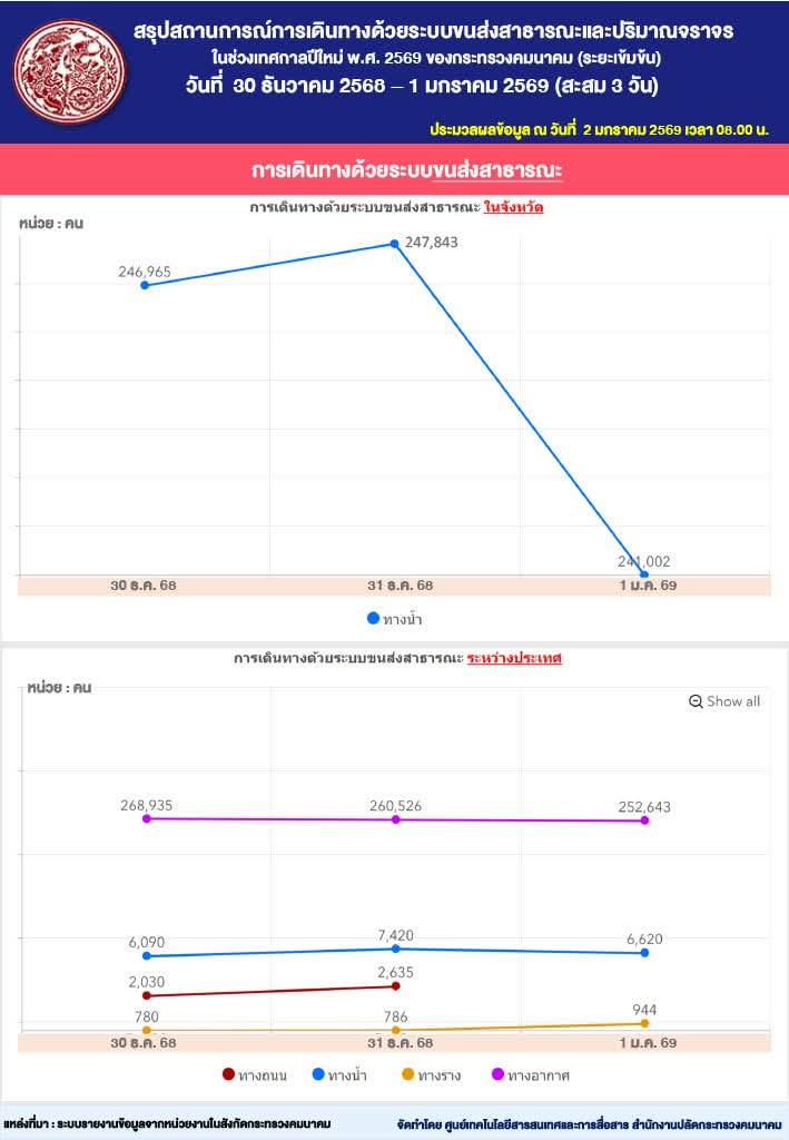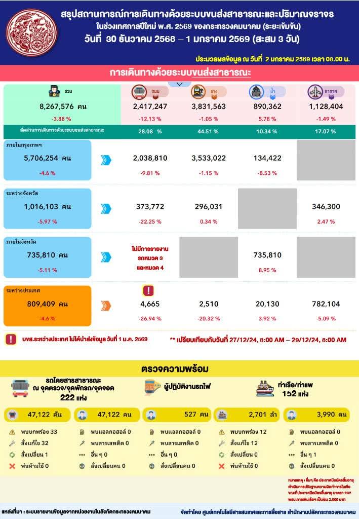 ศูนย์ปฏิบัติการความปลอดภัยคมนาคม (ศปภ.คค.) กระทรวงคมนาคม สรุปข้อมูลการเดินทางบนโครงข่ายคมนาคม สะสม 3 วัน (วันที่ 30 ธันวาคม 2568 - 1 มกราคม 2569) (ข้อมูล ณ วันที่ 2 มกราคม 2569 เวลา 08.00 น.) พบว่า ระบบขนส่งสาธารณะสามารถรองรับการเดินทางของประชาชนได้อย่างเพียงพอ มีการเดินทางด้วยระบบขนส่งสาธารณะรวม 8,267,576 คน ลดลงร้อยละ 3.88 เปรียบเทียบกับวันที่ 27 - 28 ธันวาคม 2567 แบ่งเป็นการเดินทางด้วยระบบขนส่งสาธารณะภายในประเทศ 7,458,167 คน โดยระบบรางมีสัดส่วนการใช้บริการสูงสุด คิดเป็นร้อยละ 45 ขณะที่ผู้ใช้บริการสูงสุดในแต่ละภูมิภาค ได้แก่ ภาคกลาง (ทางอากาศขาออก) 162,994 คน ภาคใต้ (ทางราง) 102,504 คน ภาคตะวันออกเฉียงเหนือ (ทางถนน) 84,557 คน ภาคเหนือ (ทางราง) 54,203 คน และภาคตะวันออก (ทางถนน) 59,570 คน ส่วนการเดินทางด้วยระบบขนส่งสาธารณะระหว่างประเทศมีจำนวนรวม 809,409 คน ลดลงร้อยละ 4.6 สำหรับการจราจรเข้า - ออกกรุงเทพฯ บนทางหลวงสายหลัก 12 เส้นทาง มีปริมาณ 3,107,227 คัน ลดลงร้อยละ 6.15 และการเดินทางภายในกรุงเทพฯ บนทางด่วนของการทางพิเศษแห่งประเทศไทย มีปริมาณ 3,825,040 คัน ลดลงร้อยละ 20.99