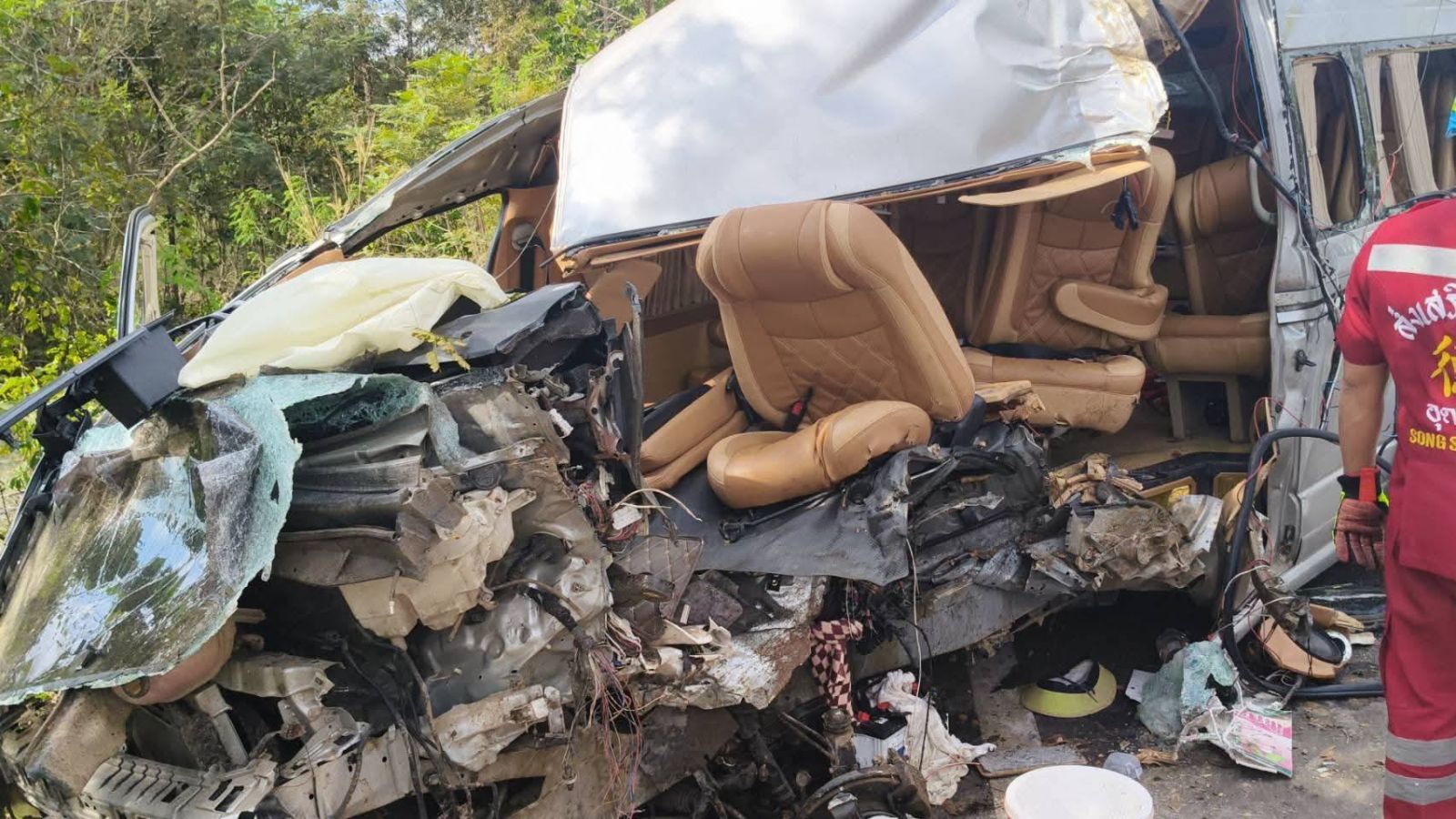 ที่เกิดเหตุ พบรถตู้ โตโยต้า สีเทา ลักษณะชนเข้ากับต้นไม้ข้างทาง ตรวจสอบพบว่า มีผู้บาดเจ็บทั้งหมด 9 ราย โดยมี 1 รายอาการสาหัสและติดค้างในยานพาหนะ ทางอาสาสมัครกู้ชีพ-กู้ภัย ร่วมดำเนินการใช้เครื่อมือตัดถ่างงัดรถ และนำส่งโรงพยาบาลพิบูลย์รักษ์ ในเวลาต่อมา รับแจ้งว่า ผู้บาดเจ็บเป็นชายไทย 1 ราย ที่อาการสาหัส ได้เสียชีวิตที่โรงพยาบาลพิบูลย์รักษ์