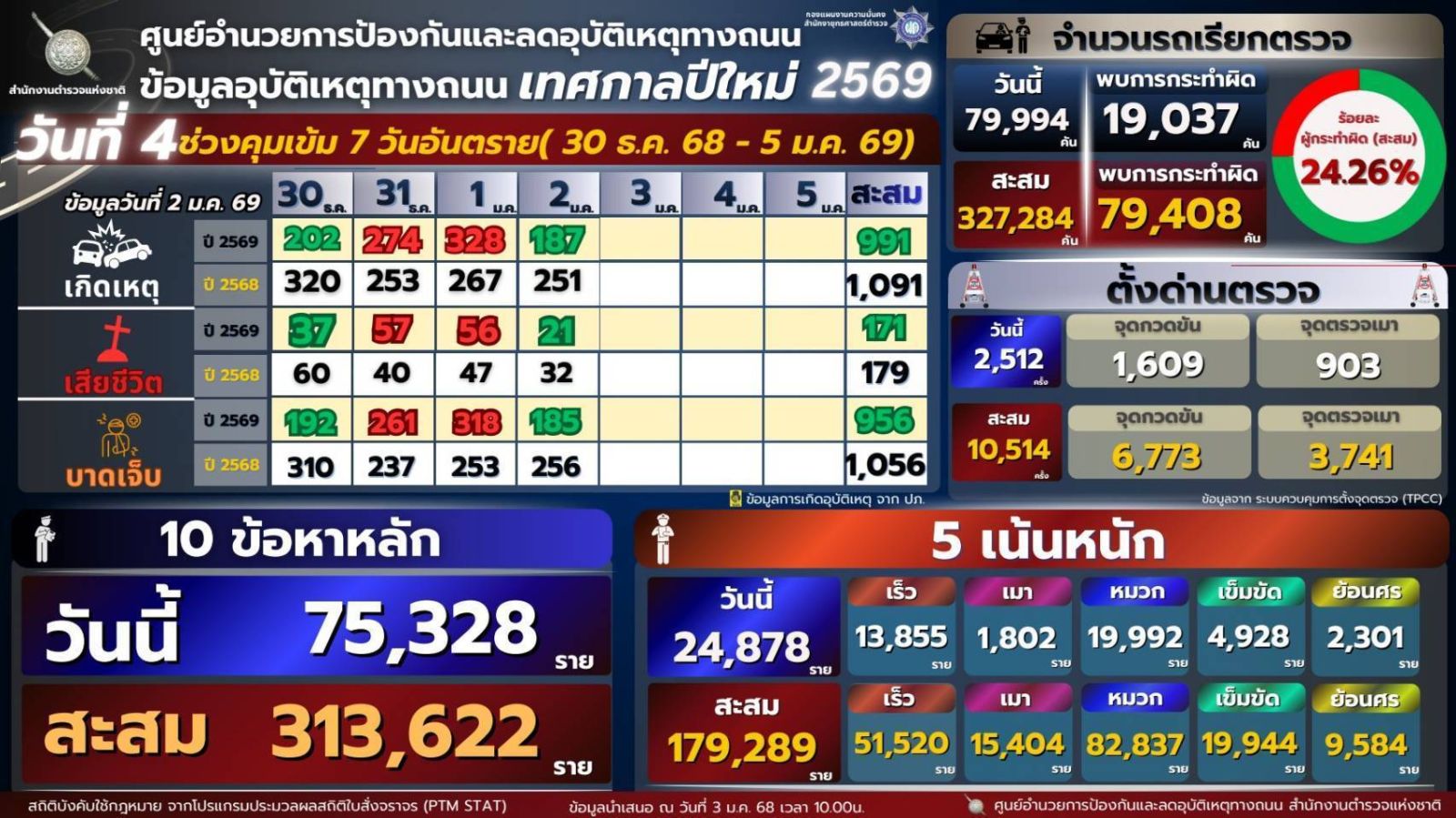 จากสถิติการเกิดอุบัติเหตุทางถนนในช่วง 4 วันของเทศกาลปีใหม่ 2569 คือวันที่ 30 ธันวาคม 2568 ถึงวันที่ 2 มกราคม 2569 ภาพรวมทั้งประเทศ เสียชีวิต 171 ราย บาดเจ็บ 956 ราย พบว่าลดลงจากช่วงเวลาเดียวกันของปีที่ผ่านมา โดยในส่วนของการบังคับใช้กฎหมายเพื่อป้องกันและลดอุบัติเหตุทางถนน ใน 10 ข้อหาหลักที่เป็นสาเหตุของการเกิดอุบัติเหตุ มีการจับกุมรวมทุกคดีใน10ข้อหาหลักถึง 313,622 ราย โดยเป็นการจับกุมเมาแล้วขับ รวมแล้วจำนวน 15,404 ราย ในจำนวนนี้เป็นการดำเนินคดีกับผู้กระทำผิดซ้ำเมาแล้วขับ จำนวน 100 ราย ซึ่งผู้กระทำความผิดฐานเมาแล้วขับซ้ำภายใน 2 ปี จะเข้าข่ายความผิดตามพระราชบัญญัติจราจรทางบก พ.ศ.2522 มีโทษสูงขึ้น จำคุกไม่เกิน 2 ปี ปรับตั้งแต่ 50,000 – 100,000 บาท และศาลสั่งพักใช้หรือเพิกถอนใบอนุญาตขับขี่