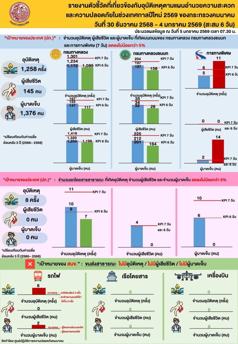 กระทรวงคมนาคม สรุปตัวเลขภาพรวมการเดินทางและอุบัติเหตุช่วงเทศกาลปีใหม่ 2569 บนโครงข่ายคมนาคมรวม 6 วัน (30 ธันวาคม 2568 - 4 มกราคม 2569) เสียชีวิตลดลงร้อยละ 30 ด้านระบบขนส่งสาธารณะรองรับการเดินทางกลับของประชาชนได้เพียงพอ ไม่มีผู้โดยสารตกค้าง