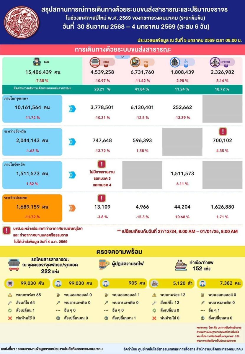 ศปภ.คค. ได้สรุปข้อมูลการเดินทางบนโครงข่ายคมนาคม ช่วงเทศกาลปีใหม่ 2569 (วันที่ 30 ธันวาคม 2568 – 4 มกราคม 2569) (สะสม 6 วัน) ประมวลผล ณ วันที่ 5 มกราคม 2569 เวลา 8.00 น. ดังนี้