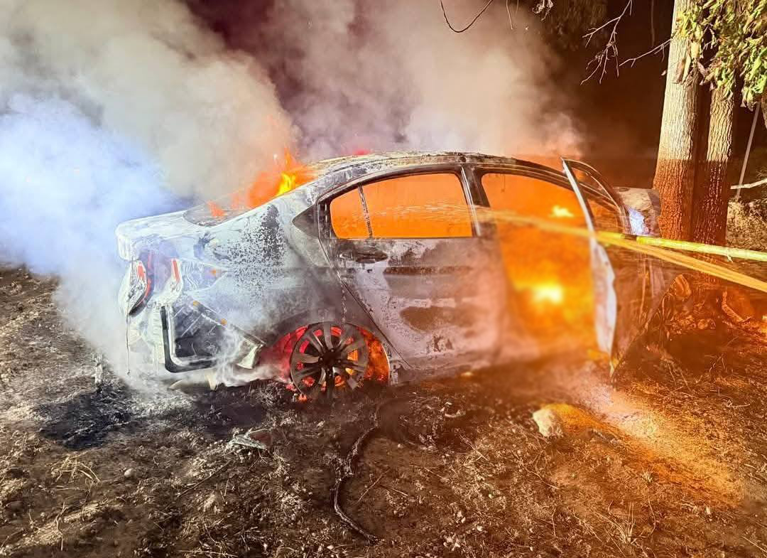 รถเก๋งเสียหลักชนต้นไม้ข้างทาง แล้วเกิดไฟลุกไหม้ เพลิงสงบพบผู้เสียชีวิตหญิง 1 ราย จ.บึงกาฬ
