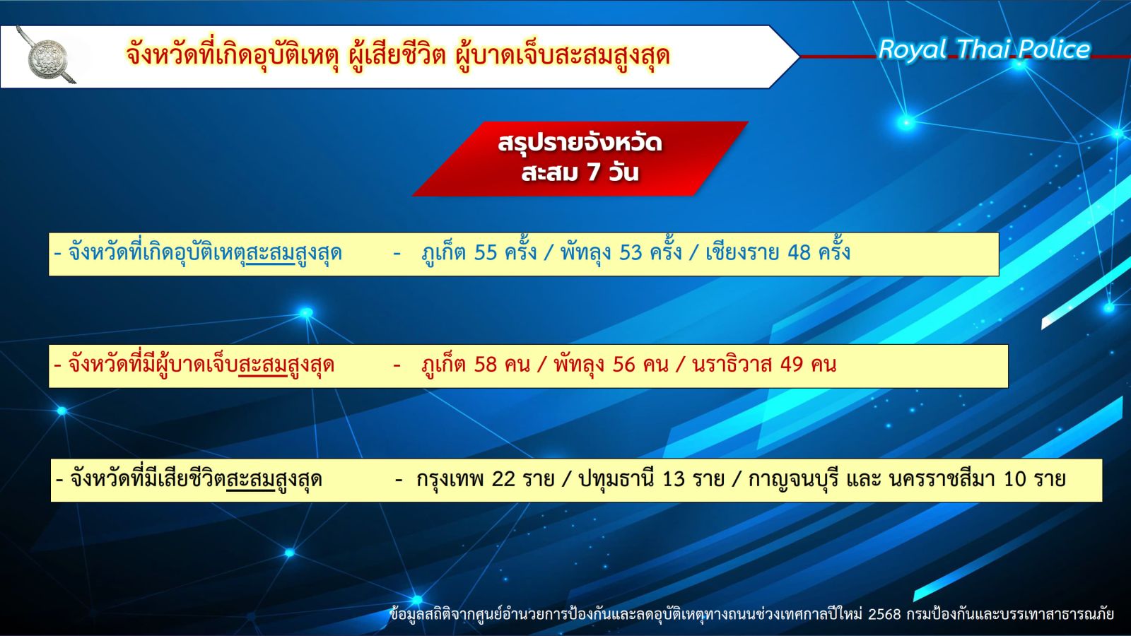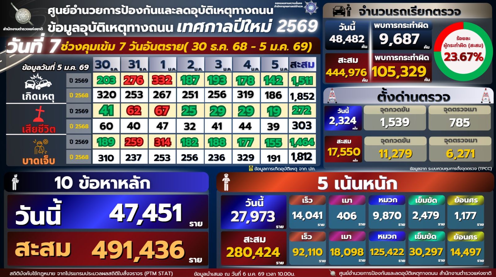 (6 มกราคม 2569) ศูนย์บริหารงานจราจร สำนักงานตำรวจแห่งชาติ (ศจร.ตร.) สรุปผลการดำเนินงานช่วงควบคุมเข้มข้น 7 วันอันตราย เทศกาลปีใหม่ พ.ศ.2569 ระหว่างวันที่ 30 ธันวาคม 2568 – 5 มกราคม 2569 พบว่า ภาพรวมสถานการณ์อุบัติเหตุทางถนนมีแนวโน้ม ลดลงอย่างชัดเจน ทั้งจำนวนอุบัติเหตุ ผู้บาดเจ็บ และผู้เสียชีวิต เมื่อเทียบกับช่วงเดียวกันของเทศกาลปีใหม่ พ.ศ.2568 สะท้อนถึงประสิทธิภาพของมาตรการด้านความปลอดภัยทางถนนและความร่วมมือของประชาชนในการปฏิบัติตามกฎจราจร