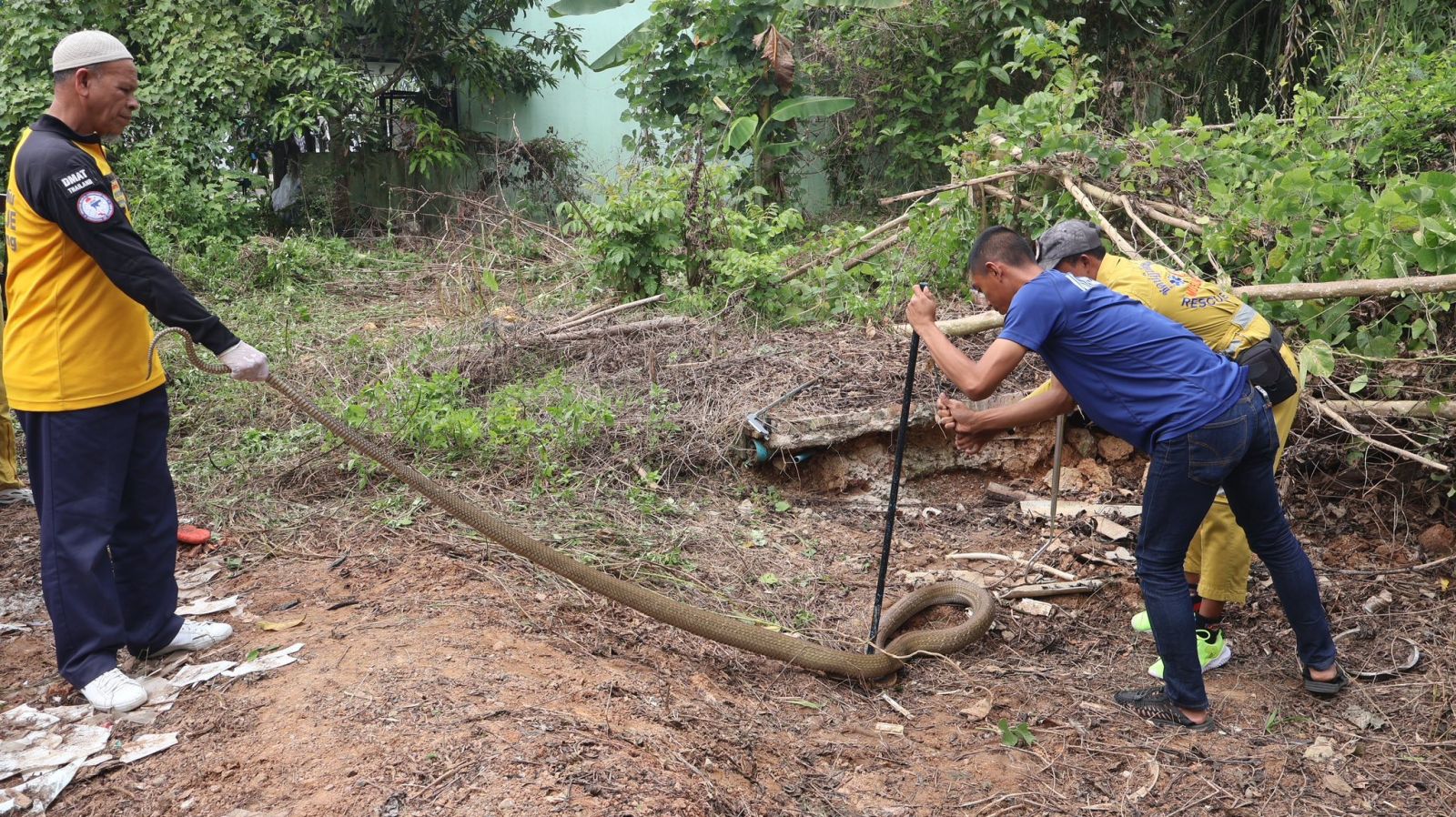 วันที่ 6 ม.ค.69 น.ส.พัชรรินทร์ ประทุมเมฆ ประธานชมรมคนรักสัตว์เบตง ได้รับแจ้งขอความช่วยเหลือจากชาวบ้านว่า พบงูจงอางอยู่ในโพรง บริเวณบ้านสวรรค์บนดอย ม.1 ต.ยะรม อ.เบตง จ.ยะลา จึงประสาน นายโยธิน ประชามติรัฐ หัวหน้าชุดปฏิบัติการกู้ชีพกู้ภัยมุสลิมเบตง ให้ส่งอาสาสมัครกู้ชีพกู้ภัยมุสลิมเบตง นำอุปกรณ์การจับงู เข้าช่วยเหลือ เมื่อเดินทางไปถึงพบว่า มีงูจงอาง 2 ตัว อยู่ในโพรง ใต้พื้นห้องน้ำเก่า ซึ่งมีหญ้าปกคลุมอยู่ อาสาสมัครกู้ภัยจึงใช้ความระมัดระวังเป็นอย่างมากเพราะมี งูจงอางถึง 2 ตัว อยู่ภายใน
