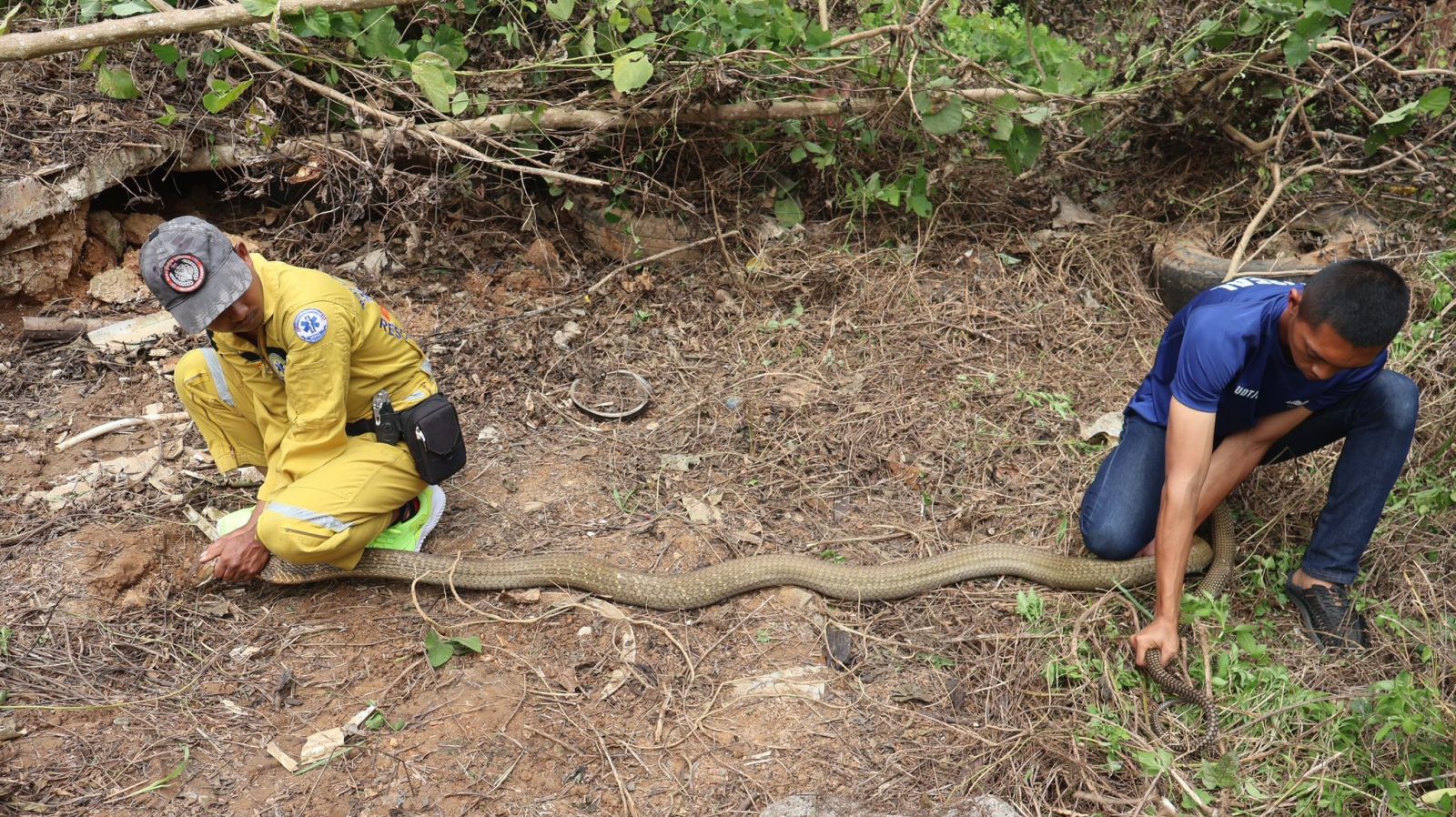 คนขับผงะ ไถดินปรับพื้นที่ เจองูจงอาง 2 ตัวยาว 4 เมตร จ้องหน้าไม่หนี รีบแจ้งกู้ภัยจับปล่อยคืนสู่ป่าธรรมชาติ ส่วนอีกตัวหนีไปได้ที่ เบตง จ.ยะลา