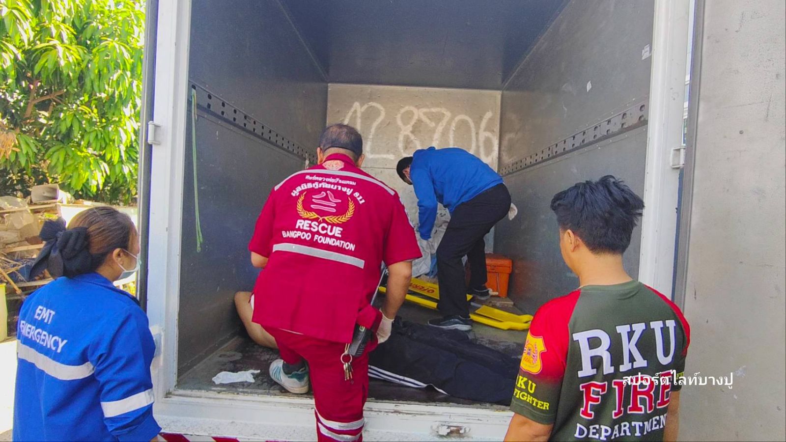 ที่เกิดเหตุพบ นายเอ (นามสมมุติ) อายุ 34 ปี มีบาดแผลถูกแทงที่ลำคอ ยาวประมาณ 2 นิ้ว อาการสาหัส นอนขอความช่วยเหลืออยู่หลังรถตู้ทึบ เจ้าหน้าที่กู้ภัยบางปูให้การช่วยเหลือก่อนนำส่งโรงพยาบาลสมุทรปราการ